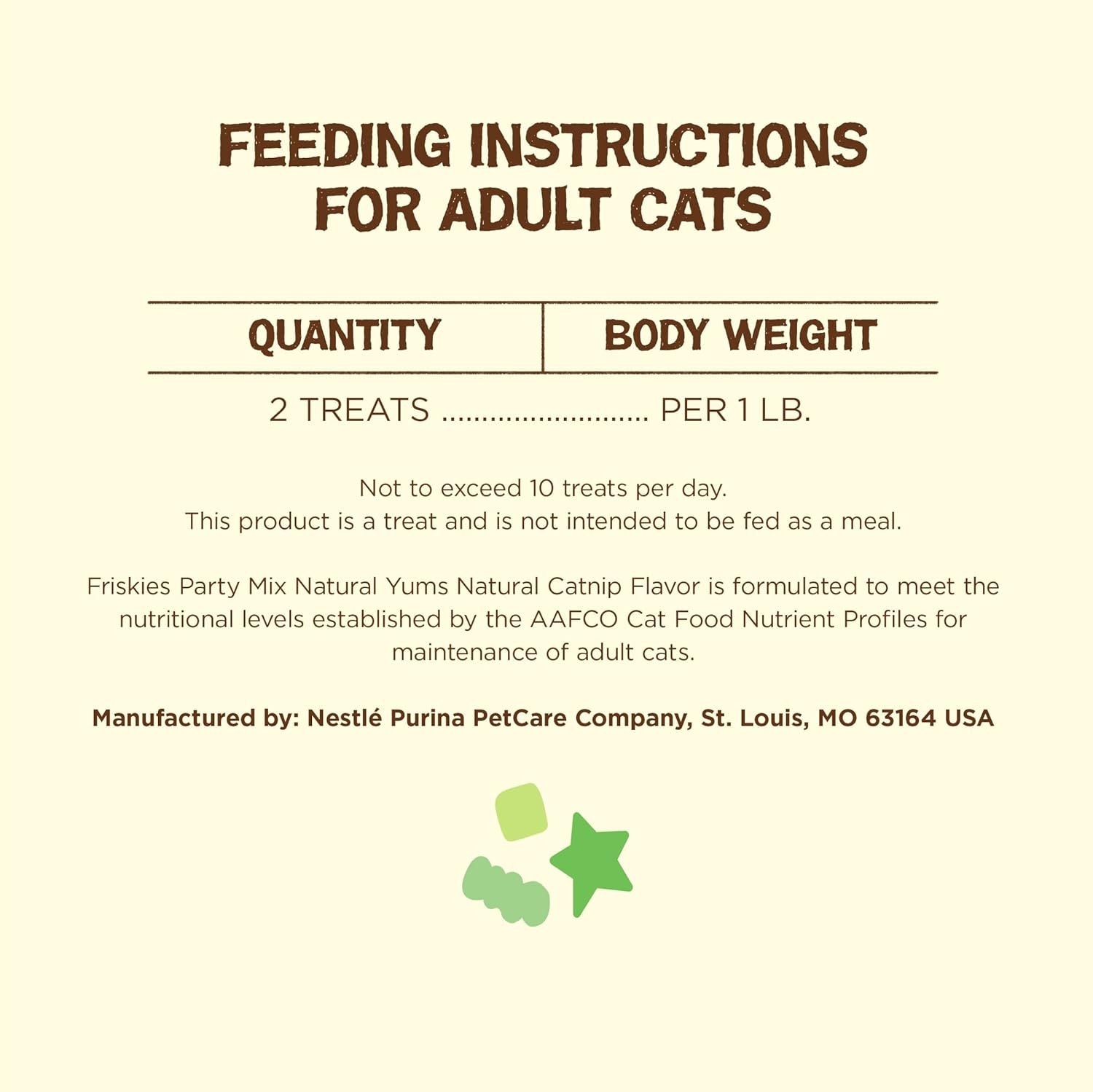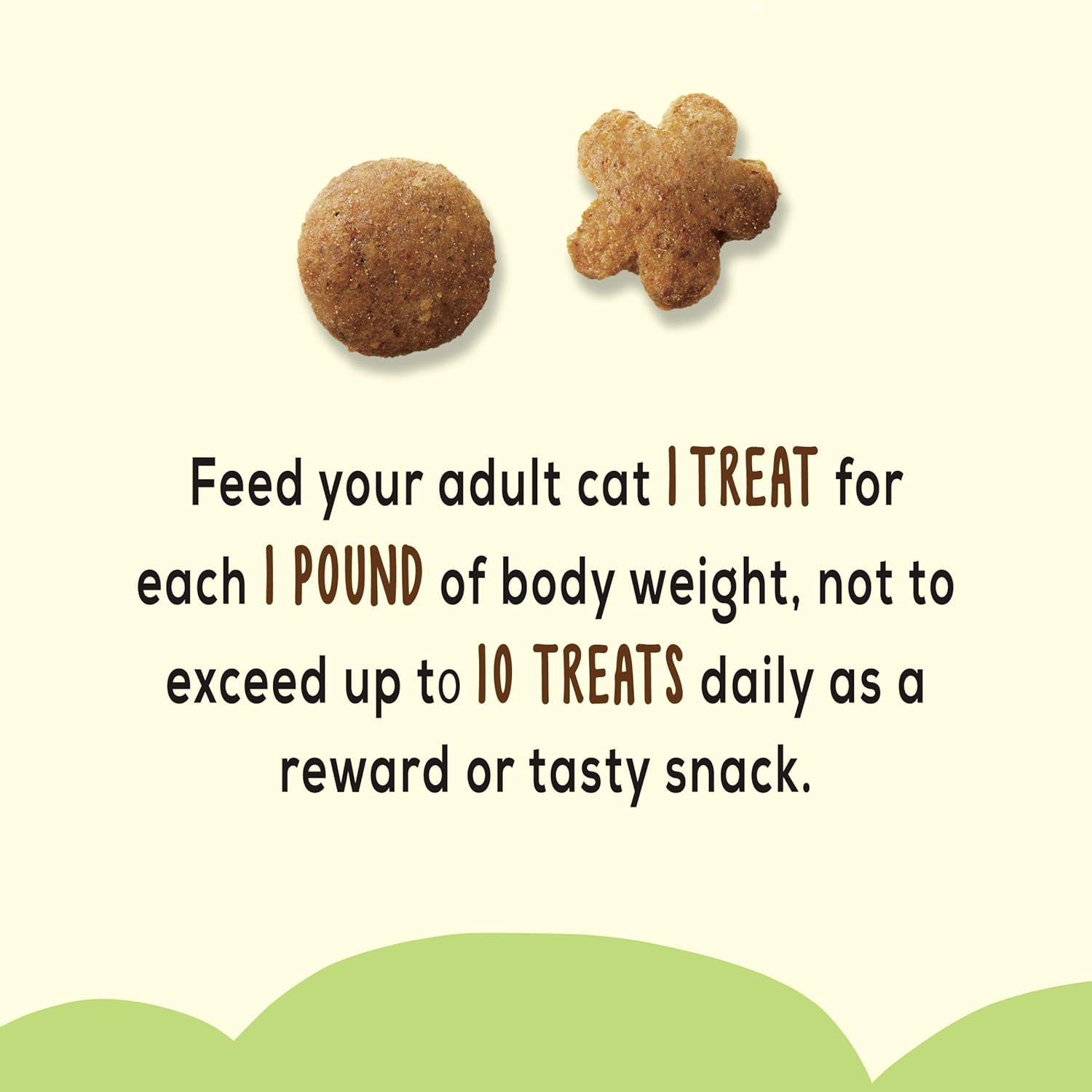 Feed adult cats up to 2 treats for each 1 pound of body weight with a maximum of 10 treats daily