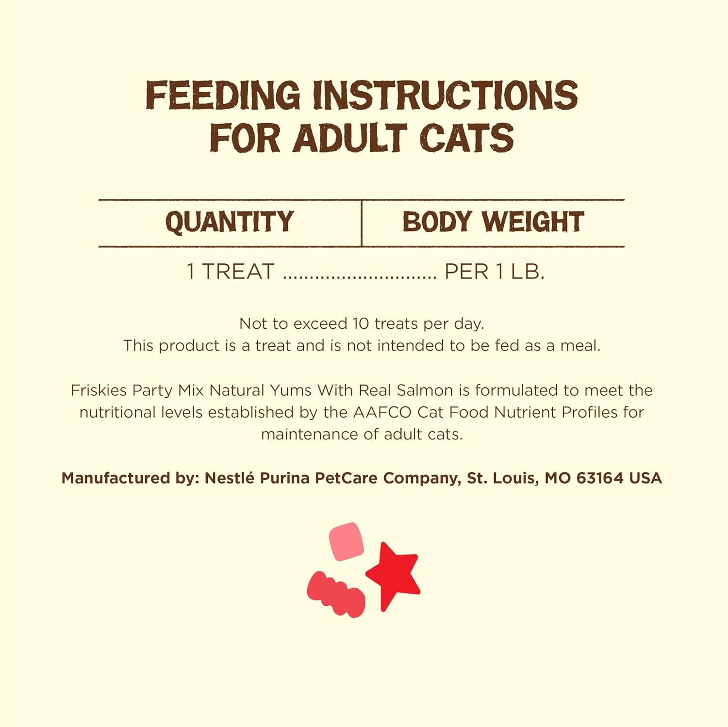Celebrate your special relationship when you offer your cat Purina Friskies Party Mix Natural Yums Salmon With Added Vitamins & Minerals adult cat treats. Made with real fish as the #1 ingredient, these wholesome treats for adult cats give your feline friend the mouthwatering seafood flavor she craves. These tasty treats are the purr-fect way to pamper your kitty because they contain 100 percent complete and balanced nutrition for adult cats. Keep her happy between meals with one or two treats, or dole out a few pieces along with her dinner to show your love. Fun shapes hold her attention as she crunches away at these yummy treats, which are made without artificial colors, flavors or preservatives. Tear open a pouch of Purina Friskies Party Mix Natural Yums With Real Salmon With Added Vitamins & Minerals adult cat treats to delight your precious pet with tasty flavor and high-quality ingredients.