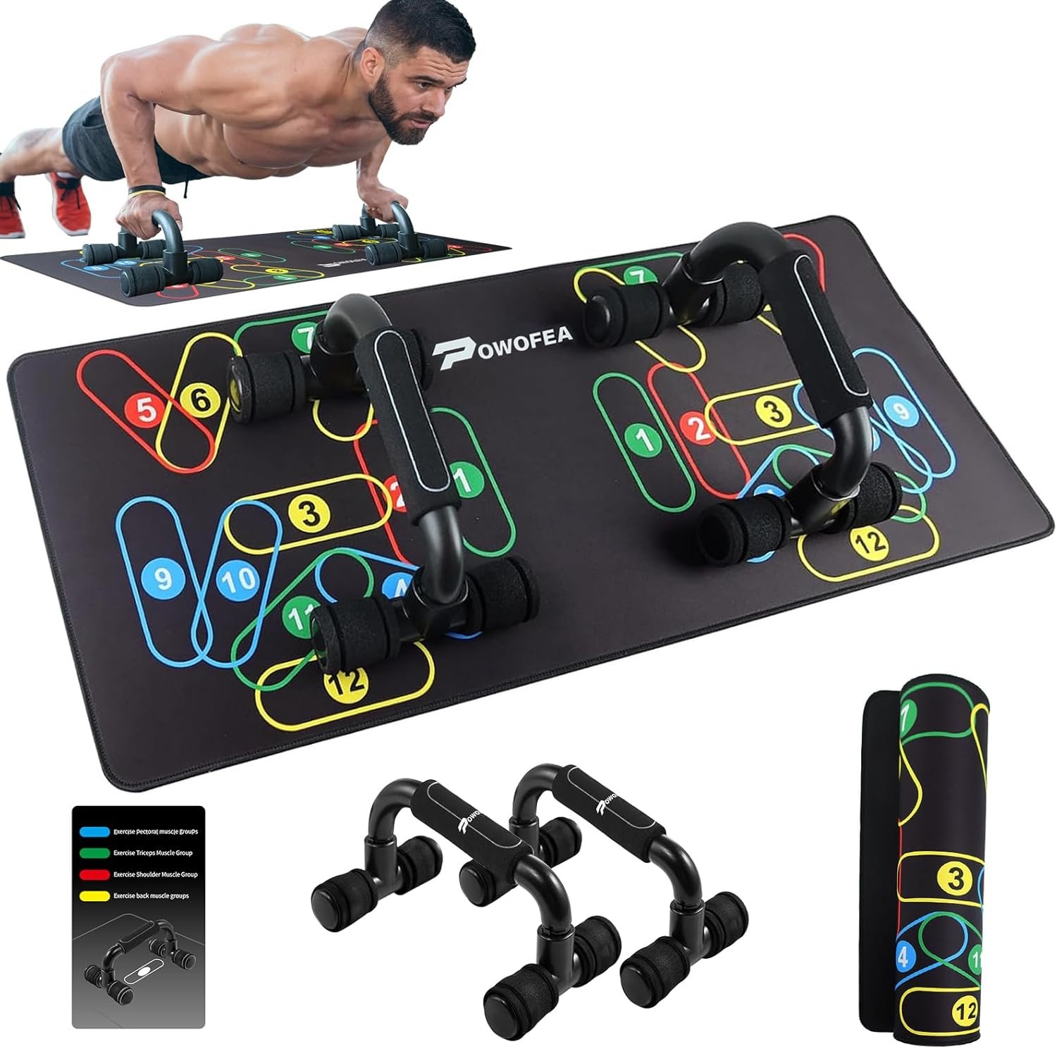 【Portable Home Gym】: Come with push up mat, push up handles for floor. Compact and lightweight, the push up pad can be rolled up directly. Which is a great way to work out all parts of your body and save space at the same time. Perfect for home workouts.