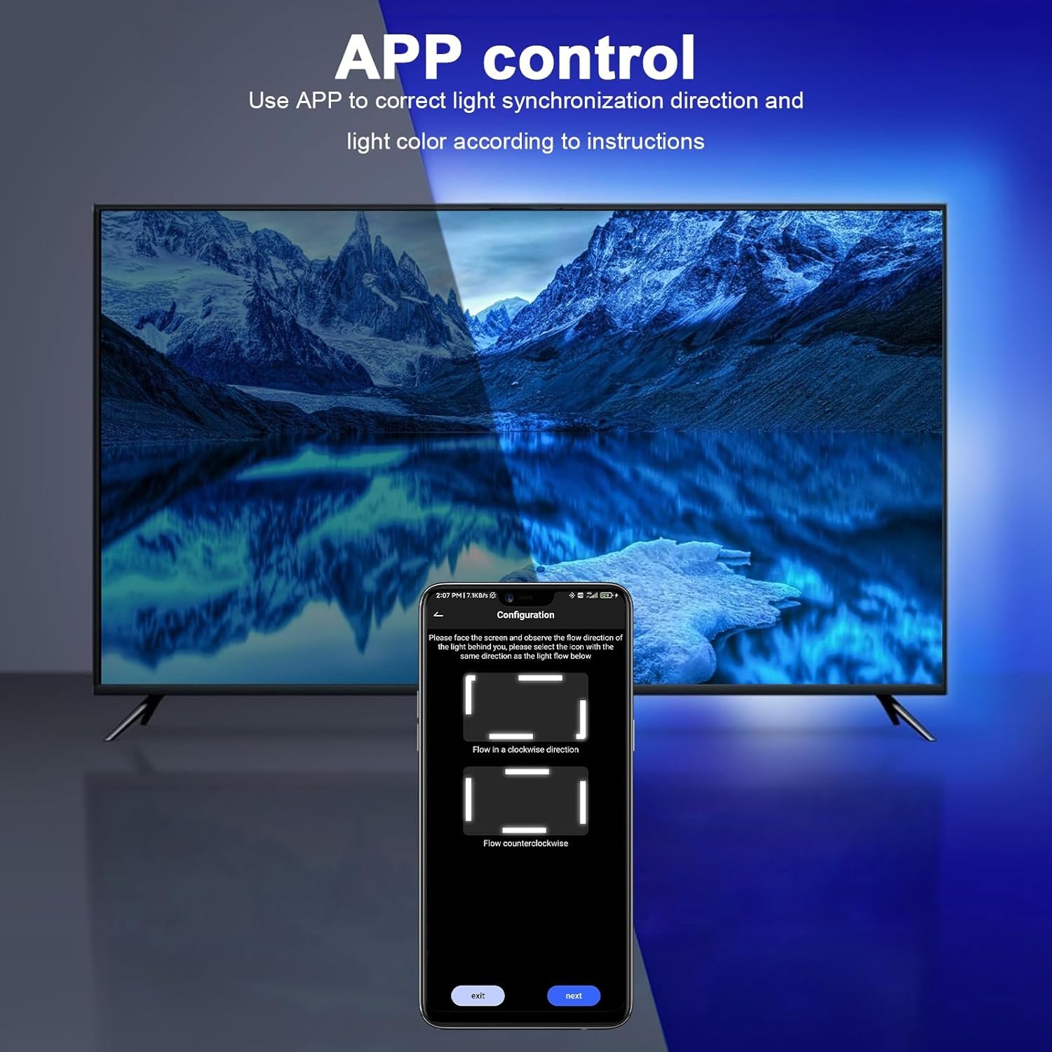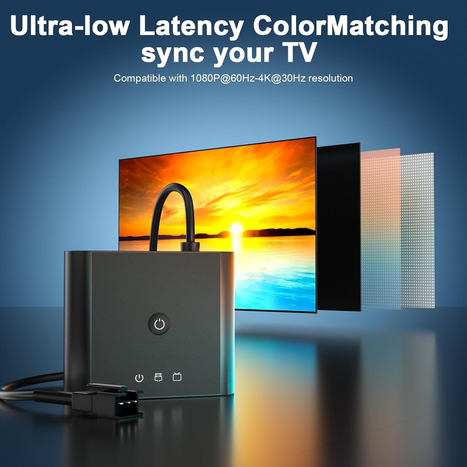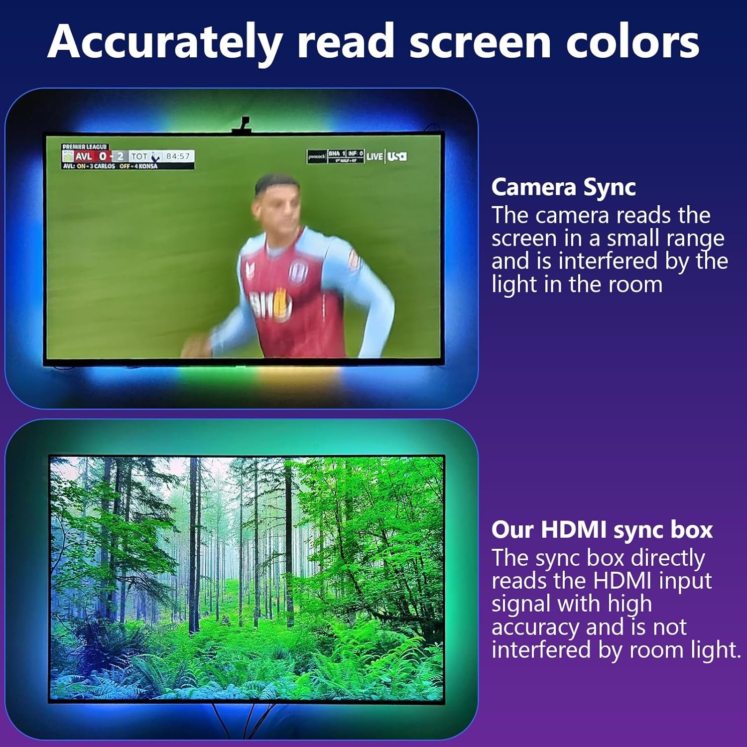 Audio and video sync : Compared with the traditional camera to capture the light source and the APP synchronous light source, our TV LED backlight request signal source through HDMI 1.4b(4K@30Hz)sync box, so that TV LED strip lights and the connected video source color synchronization, the real realization of 0 delay and color difference (note: only the color with the most pixels in the video will be synchronized)
