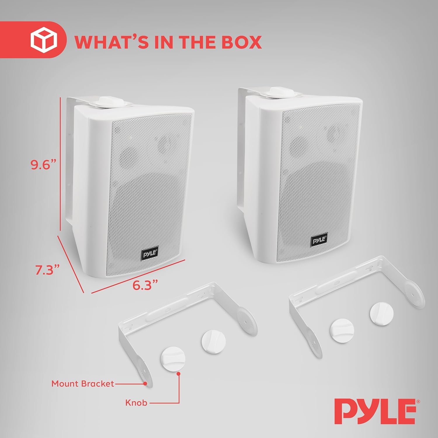 Pyle Model : PDWR51BTWT5.25” Wall Mount Water-resistant SpeakersWall Mount Water-resistant & Bluetooth 5.25” Indoor / Outdoor Speaker System, White Features:Includes (2) Speakers (Active + Passive)Built-in Digital Sound AmplifierBluetooth Wireless Music StreamingMarine Grade Water-resistantConstructionAux (3.5mm) Input ConnectorAbility to Connect External Devices2-Way Full Range Stereo SoundCustom Tooled Design for High Power & Deep Bass ResponseStain Resistant & Rust Proof Speaker GrillsGold Plated Binding Post Speaker PlugsHeavy Duty Cabinet EnclosureBuilt-in Capacitor Speaker ProtectionDaisy-Chain Ability (Active to Passive Speaker) as Stereo SystemExcellent for Monitor or Surround Sound ApplicationsGreat by the Pool, on the Patio or in the BoatFor Indoor / Outdoor Use Built-in Bluetooth Audio Streaming:Instantly Stream Music from Your Connected DeviceWorks with All of Your Favorite Devices (iPhone, Android, Smartphone, iPad, Tablet, PC, etc.)LED Connection Indicator Light Bluetooth Version: Bluetooth 3.0Bluetooth Network Name: Pyle AudioBluetooth Network Password: ‘0000’ (4 zeroes)Bluetooth Wireless Range: 30’+ Feet What’s in the Box: (1) Active Speaker (1) Passive Speaker12V DC Power AdapterSpeaker Connection Cable, 16′ Ft.Technical Specs:Marine Grade IP44 Rating5.25 ‘ Long Throw WoofersMAX Power Output: 240 WattRMS Power Output: 20 Watt + 20 Watt1.0” Polymer Dome TweetersMagnet Size: 10 oz.Cone Material: PP Mica + Rubber SurroundFrequency Response: 80Hz-20kHz8 Ohm ImpedancePower: 110/240VDimensions (L x W x H): 7.3” x 6.3” x 9.6”The Pyle PDWR51 mountable speaker systems provide high-powered wireless Bluetooth performance indoors or out! Featuring rugged marine grade Water-resistant construction, they are the perfect choice for adding full range stereo sound on boats, decks, patios or backyards. The system includes (2) speakers; one active and one passive, along with a built-in digital amplifier. Once connected, the polymer dome tweeters create crisp high frequency sound and the fortified long-throw woofers generate some impressive bass. Built-in Bluetooth audio streaming ability allows you to connect and stream audio from all of your favorite devices, quickly and easily (works with iPhones, Androids, Smartphones, Tablets, Laptops, Computers, etc.). You will also have the ability to connect additional external devices to your speaker system thanks to the gold-plated speaker binding post plugs. Excellent for monitor or surround sound applications rain or shine! Add instant wireless streaming ability and high-powered Water-resistant audio performance with the Pyle PDWR51 indoor/outdoor speaker systems.