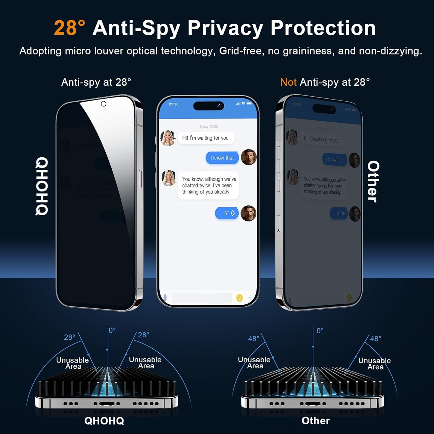 Powerful Privacy Protection: QHOHQ’s groundbreaking privacy screen protector for iPhone 16 Pro Max achieves 28° of super strong privacy protection, providing a 152° wide anti-peeking range, so that onlookers can only see the deep black screen in any environment, protecting the absolute privacy of screen information