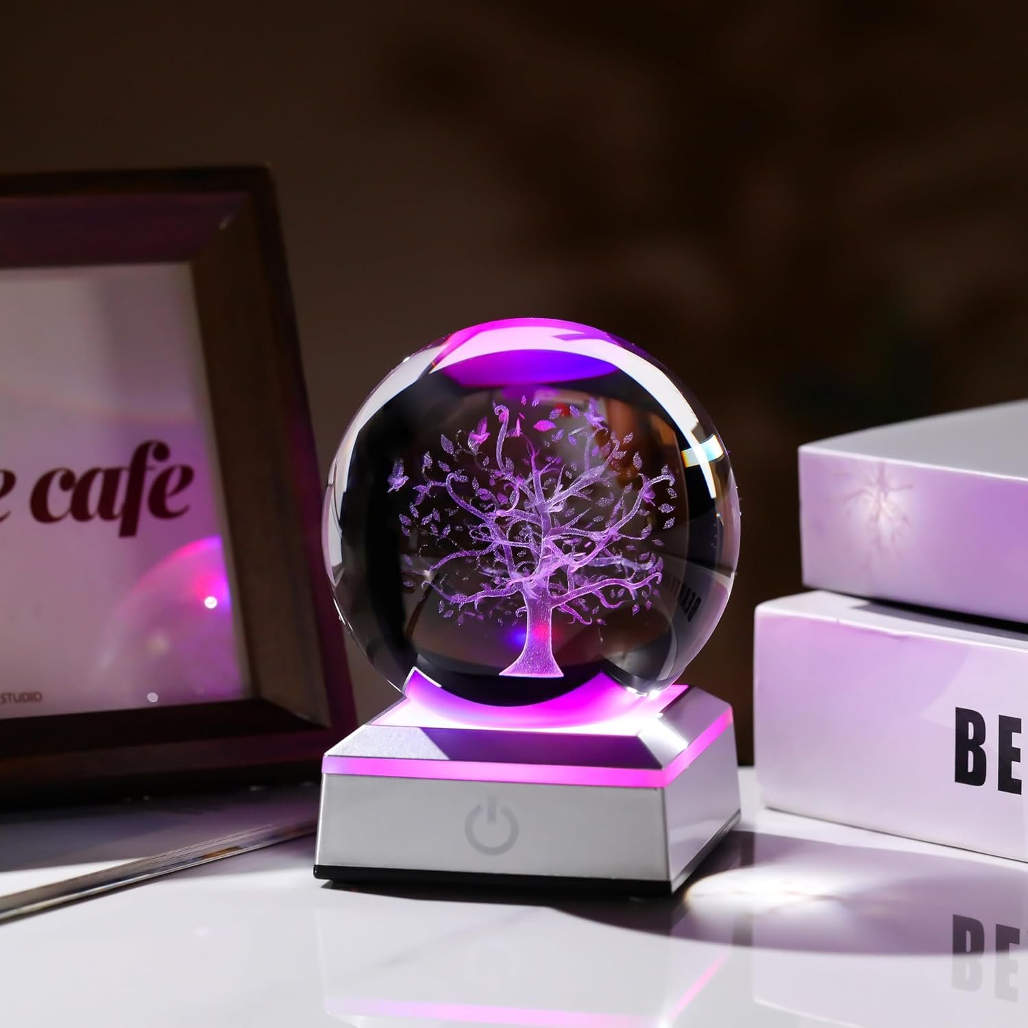 Qianwei 3D The Tree of Life Crystal Ball with LED Colorful Lighting Touch Base,Flower of Life Meditation Chakra Grid Night Light, Sacred Geometry Art Symbol for Spiritual Decor