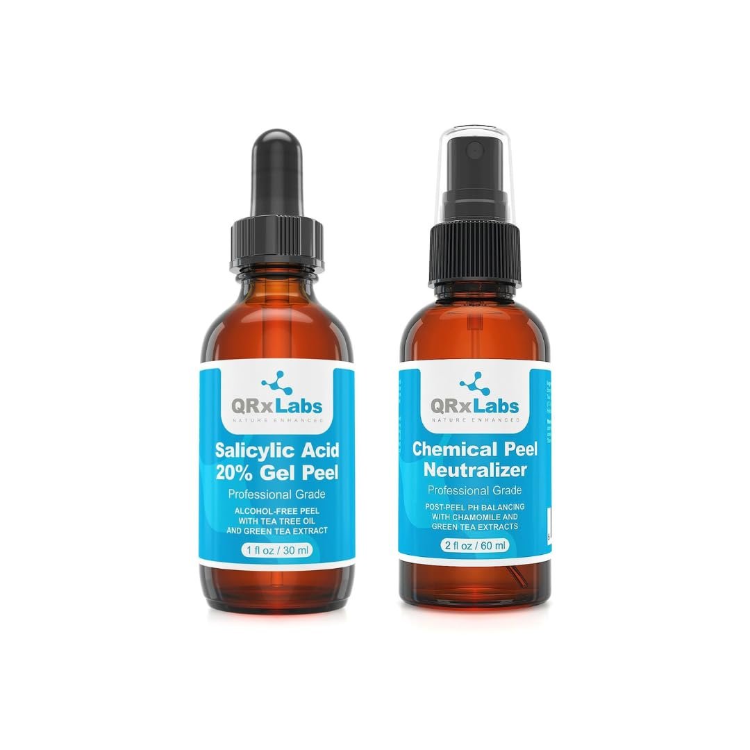 Revitalize your skin with QRxLabs Professional Peel Duo. Experience the power of the Salicylic Acid 20% Gel Peel, enriched with Tea Tree Oil and Green Tea Extract for effective acne treatment. Follow it up with the Chemical Peel Neutralizer, a skin pH balancer specially formulated for Salicylic, Lactic, and Glycolic Acid Peels. Achieve a radiant complexion with this expertly crafted duo. Your path to clear, rejuvenated skin starts here. Includes 1 fl oz Salicylic Acid Gel Peel and 2 fl oz Chemical Peel Neutralizer.