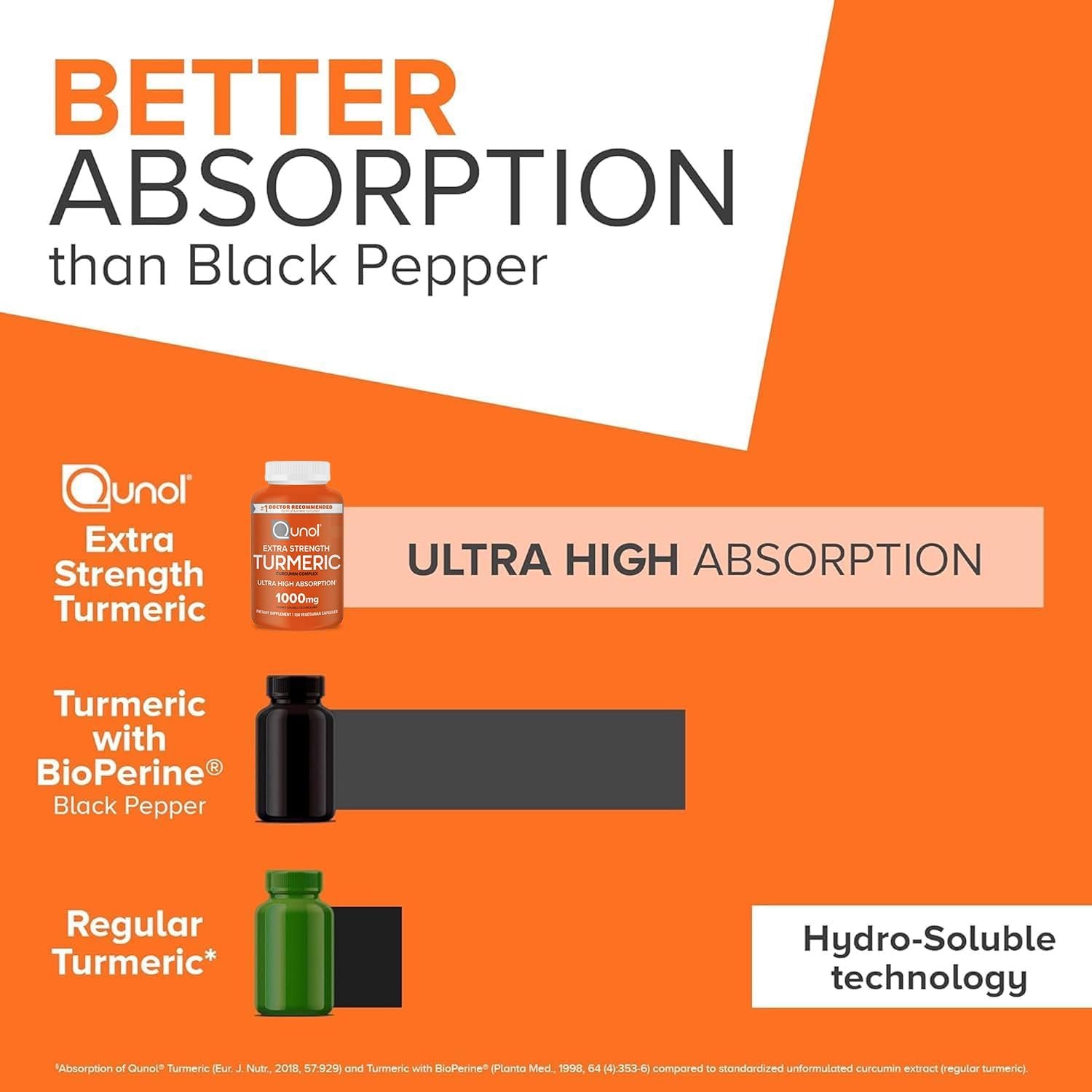 40X BETTER ABSORPTION: Qunol Extra Strength Turmeric Curcumin complex has a patented hydro-soluble technology delivering Ultra High Absorption when compared to regular turmeric which doesn’t dissolve in water, dissolves poorly in fat, and absorbs poorly