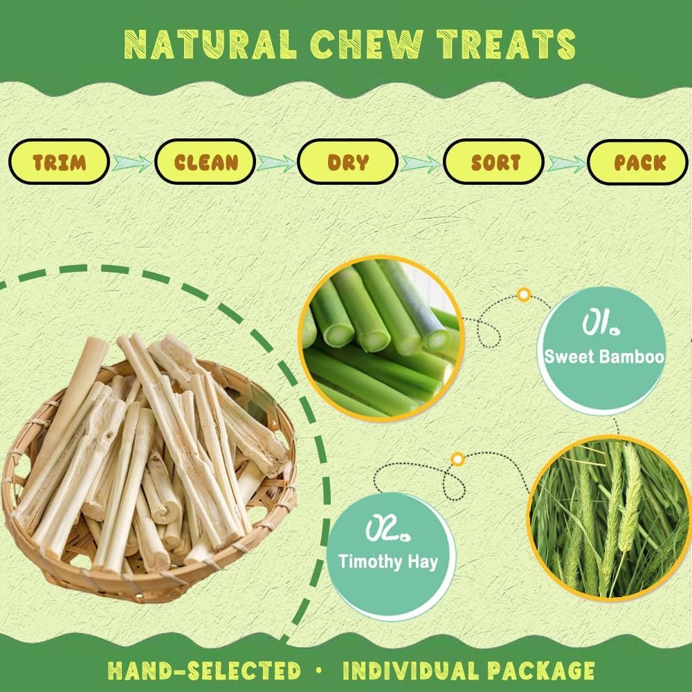 HAND-SELECTED ORCHARD CHEW TREATS: Our meticulously hand-packed to ensure only the highest quality Sweet Bamboo Sticks, and Timothy Hay Sticks arrive at your door. These different guinea pig chew sticks are healthy and delicious treats that will keep your pet nutritionally, mentally, and physically happy.