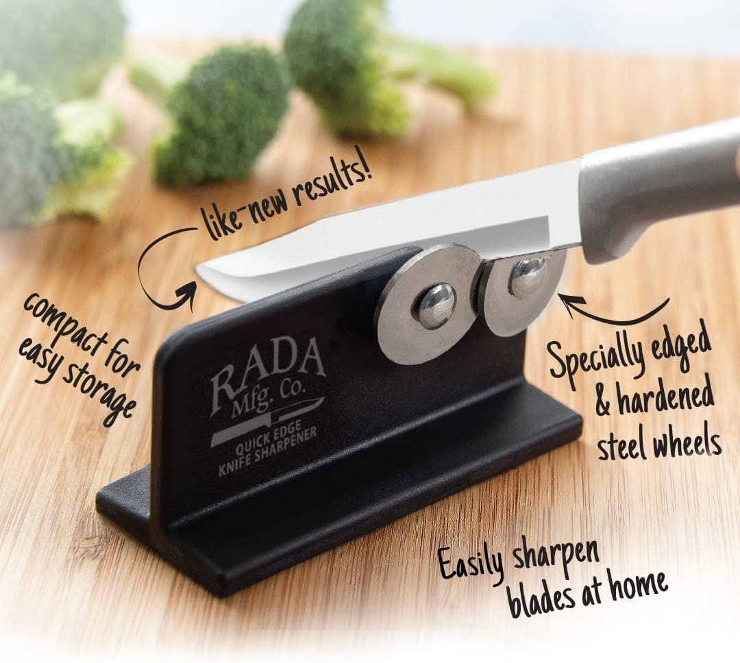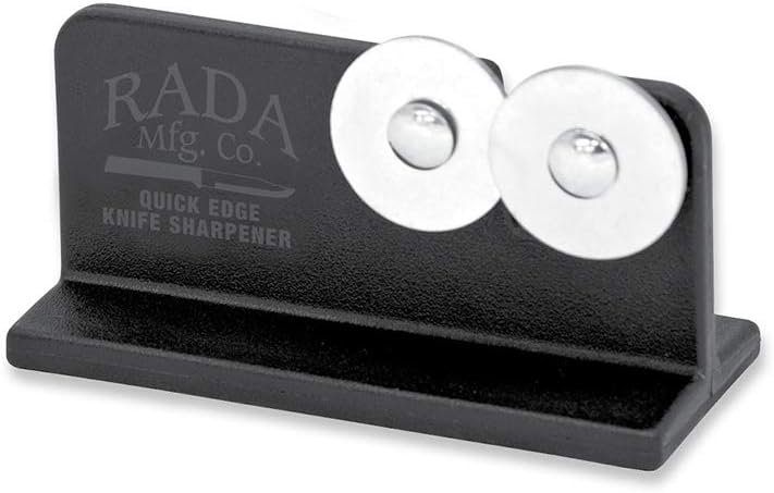 The Rada Cutlery R119 Quick Edge Knife Sharpener is a quick and easy way to keep your knives sharp, which is important for all chefs. A dull knife requires you to apply more pressure, which can be dangerous. The hardened, high carbon stainless steel wheels intersect so you can sharpen both sides of the blade at the same time. It comes with a black nylon base that is designed to be sturdy and durable. Measuring 3-1/2 x 2 inches, this knife sharpener is compact enough to fit into any kitchen drawer. For cooks on the go, this knife sharpener is portable fitting in most bags and packs up easily. It’s also perfect for hunters and fishermen that need to keep their field knife sharp. Rada Mfg. Co. is located in Waverly, Iowa and has been manufacturing cutlery in the USA since 1948. Our mission is all about “providing our customers the best value of kitchen knives for their dollar.” We stand by our craftsmanship. Rada Mfg. Co. will replace any product manufactured by our company returned to us due to defects in material or workmanship. Although this knife sharpener is specifically designed for Rada knives it can sharpen any knife you own.