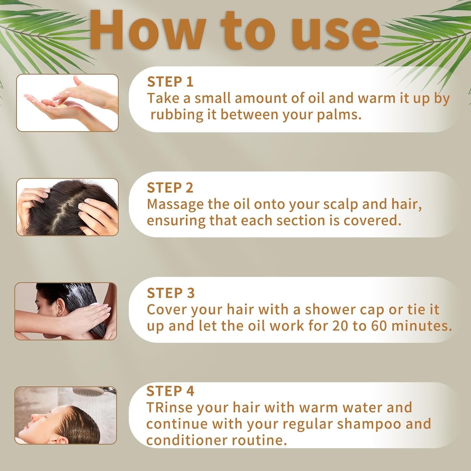 2. Massage the oil onto your scalp and hair, ensuring that each section is covered.
