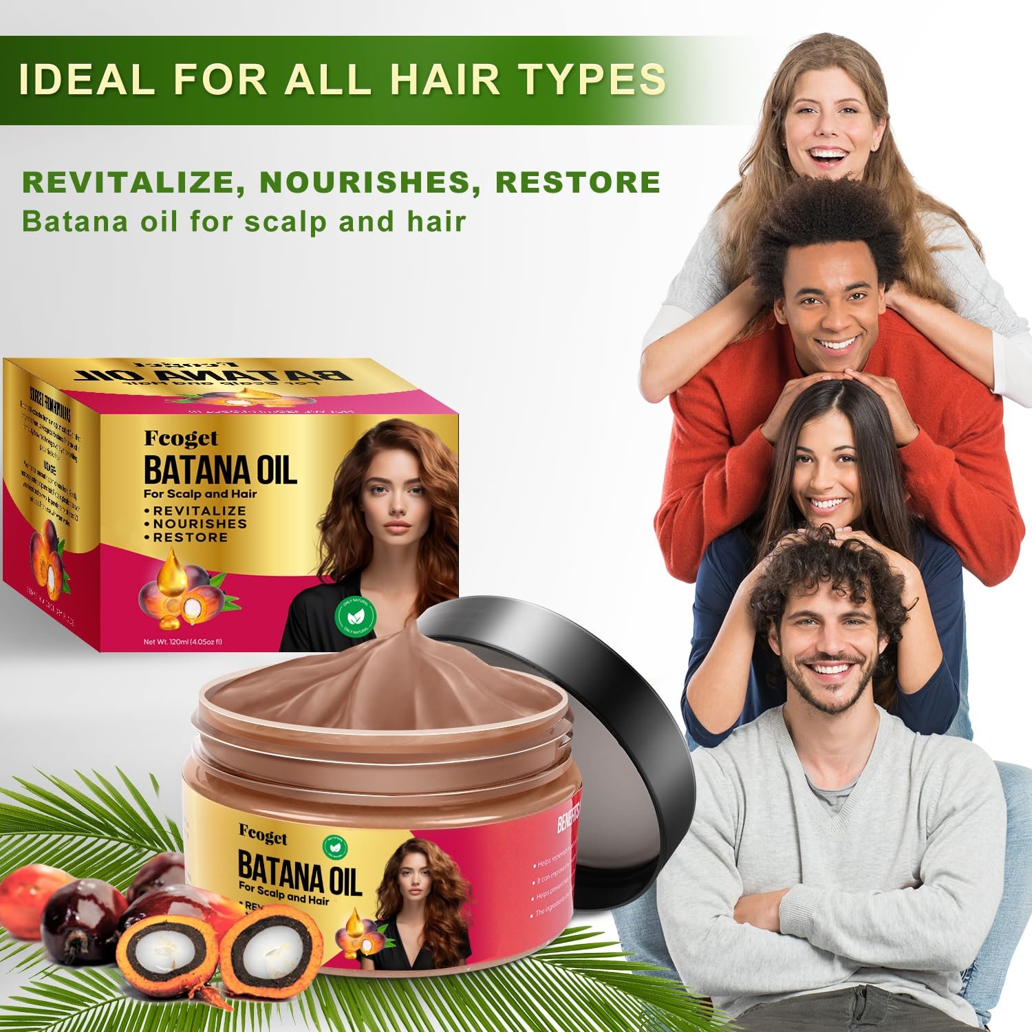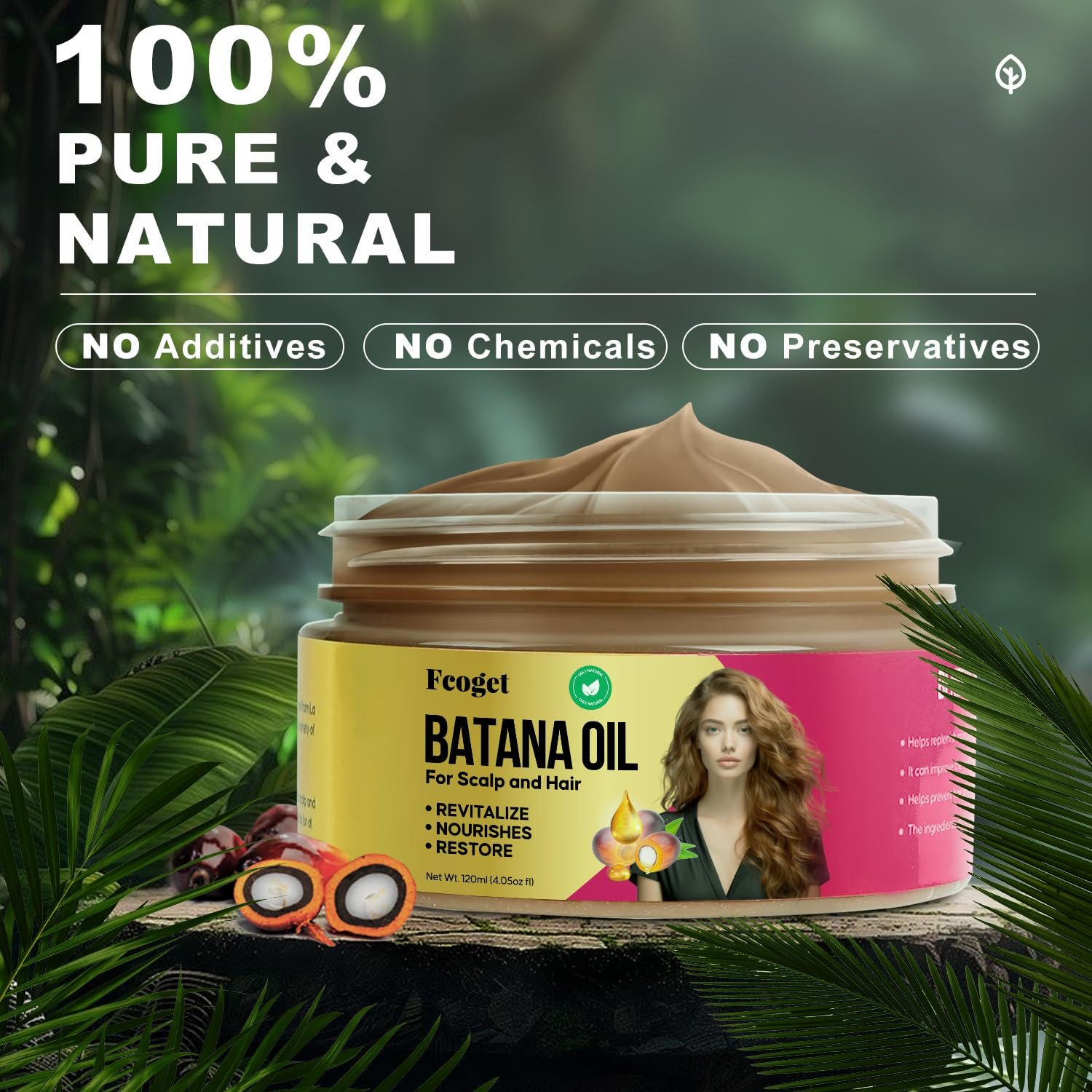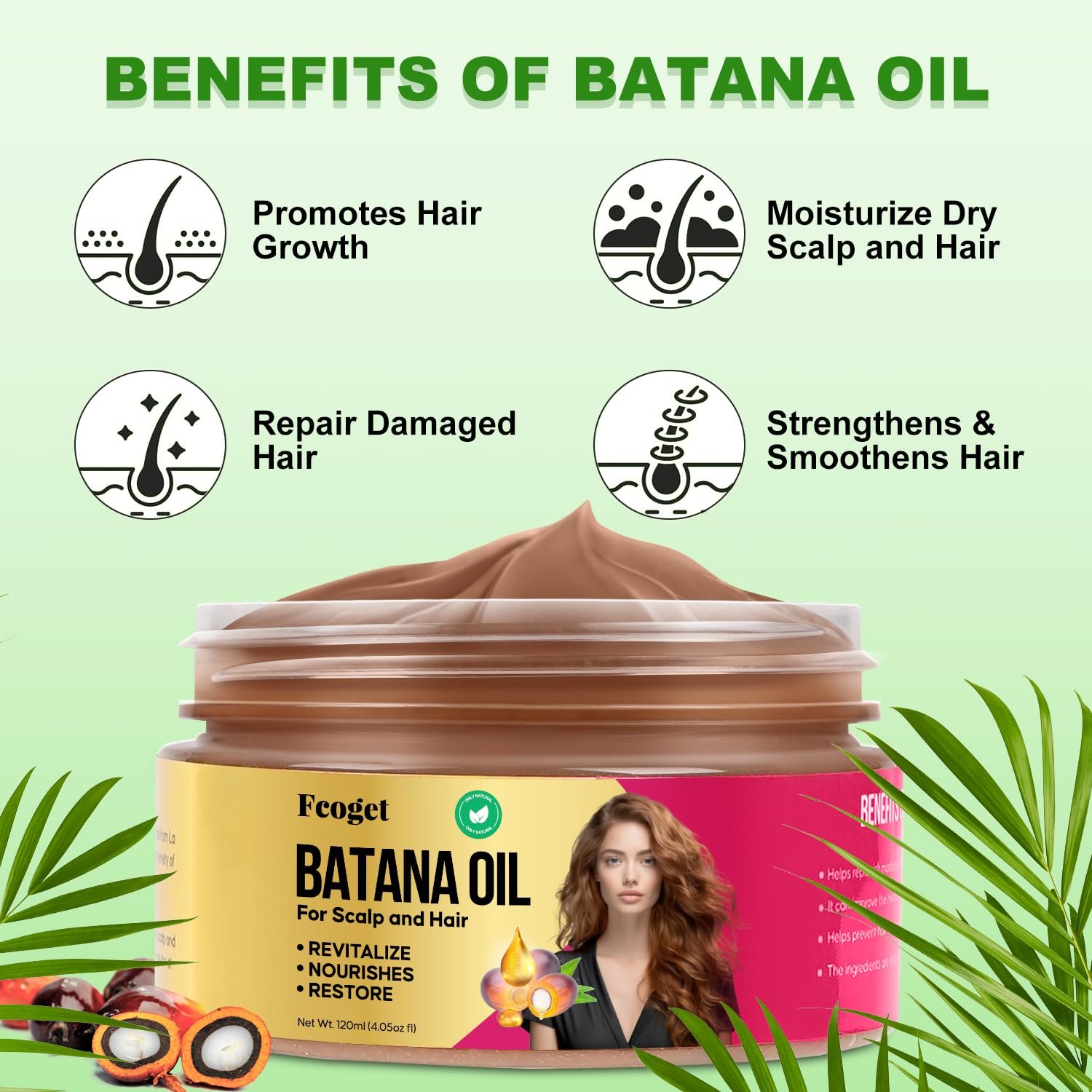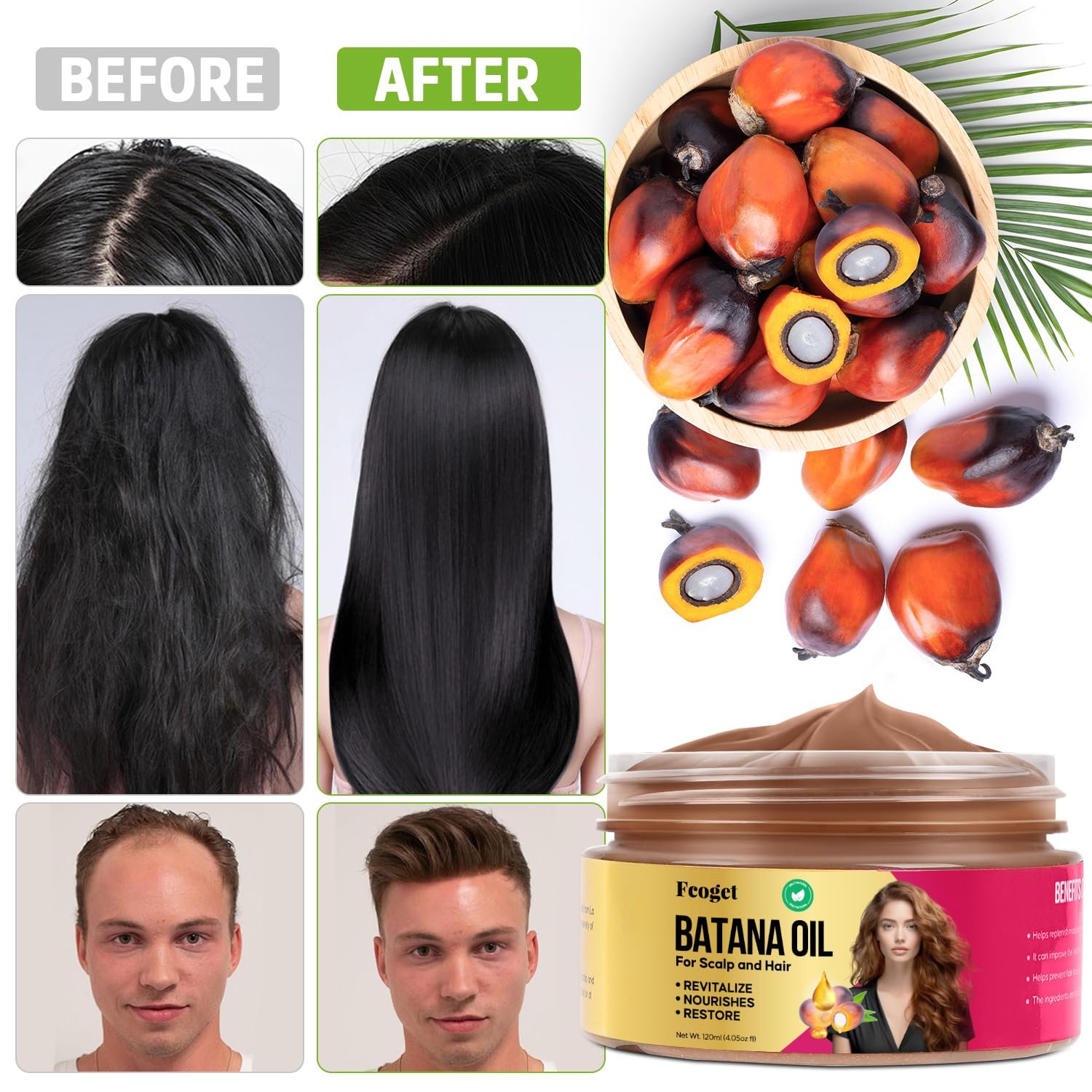 Nourish & Restore: Unrefined Batana oil promotes hair growth, enhances hair quality and shine, while moisturizing the scalp and revitalizing damaged hair.