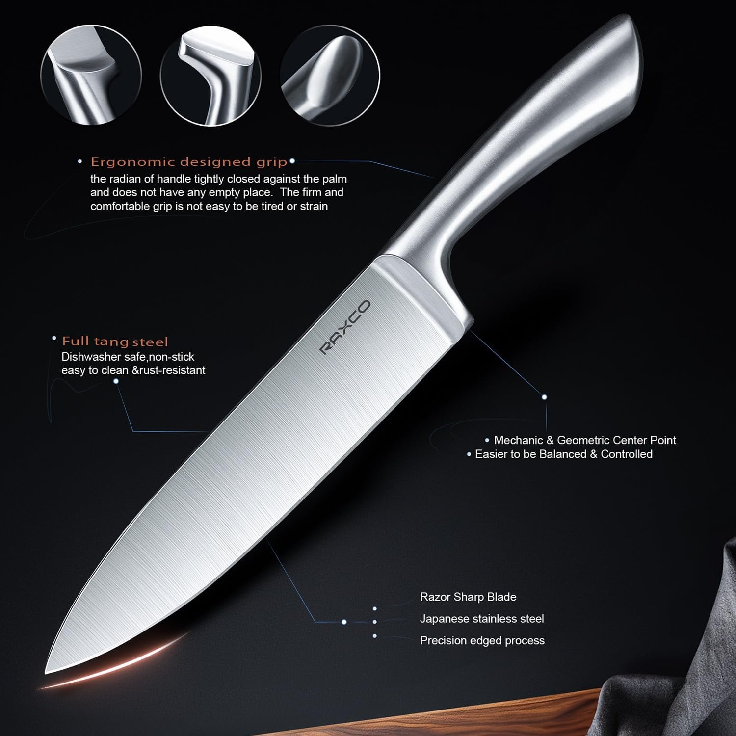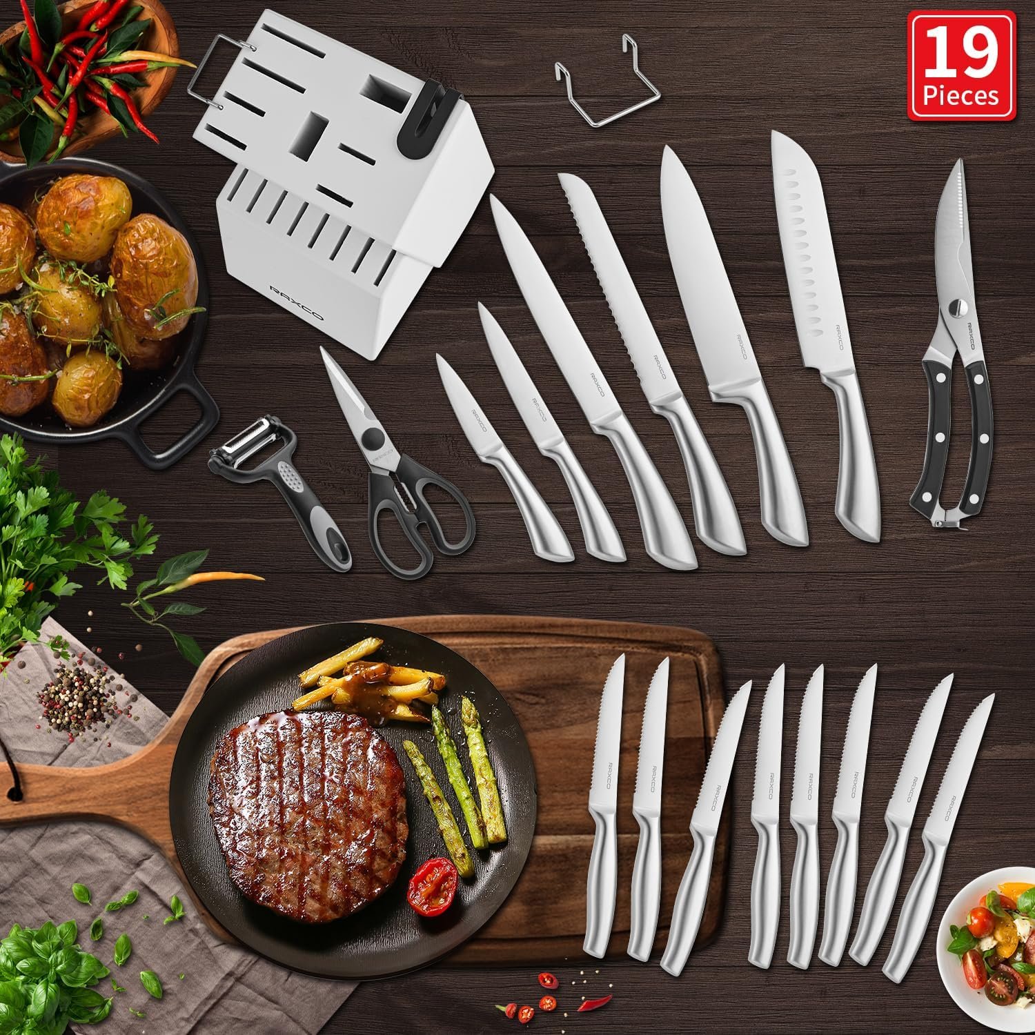 [Santoku Knife Set]:This set of knives includes7.5″santoku knife, 8 Chef Knife Set with sharpener:8″chef knife,8″slicer knife,8″bread knife,5″utility knife3.5″paring knife;8×4.5″Steak Knife Set;2x Kitchen Shears, 1x oak wood knife-blok with bult-in sharpener, 1x vegetable peeler,and 1x Kitchen Scissors rack