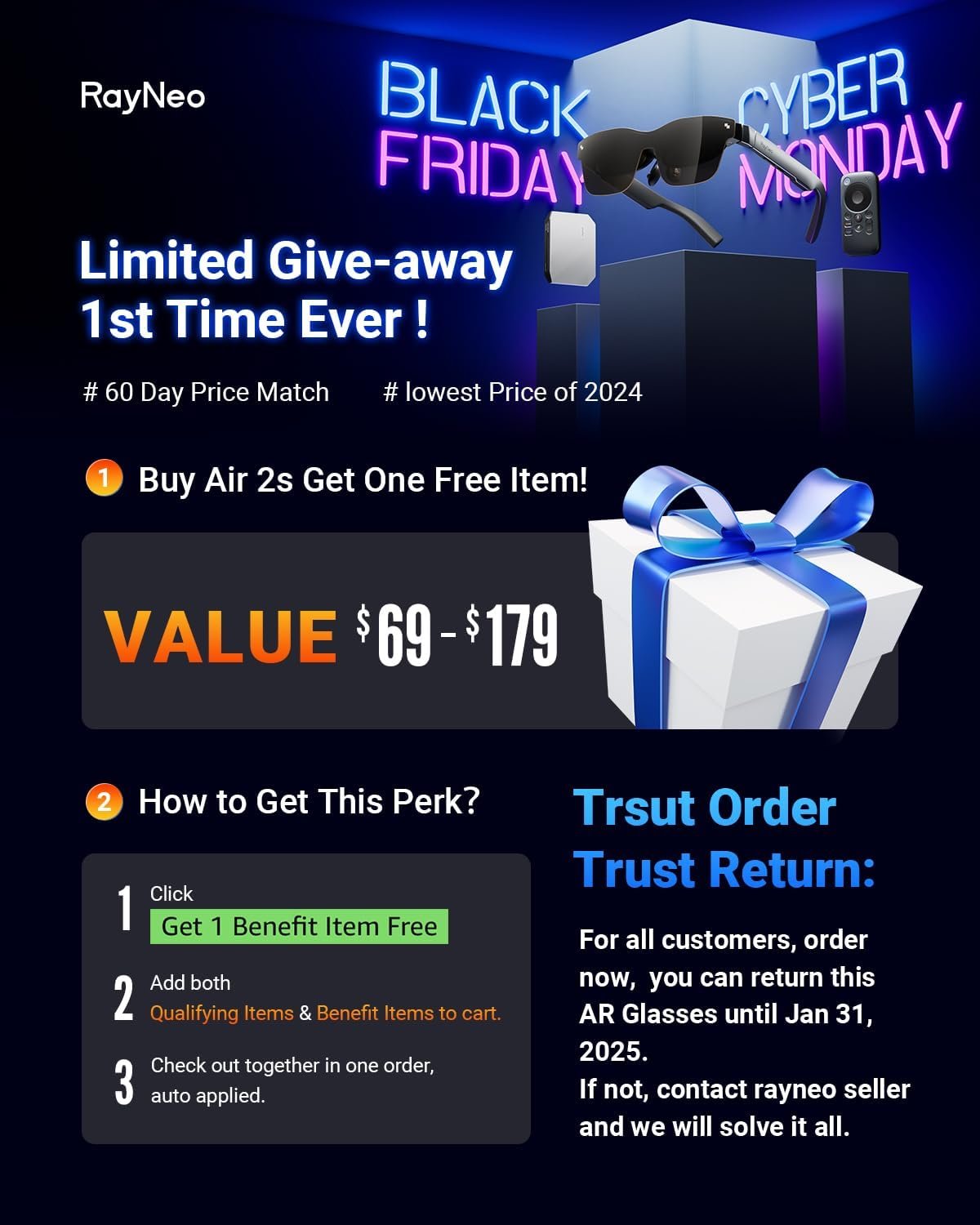 [Complete Entertainment Hub]: RayNeo Air 2s x Pocket TV are the best combo for those who binge at watching videos in leisure time or even in travel. For gaming enthusiasts who play anytime, anywhere, pair the Air 2s with JoyDock for an unmatched experience! Treat yourself—or surprise your loved one—with the perfect gift this season!