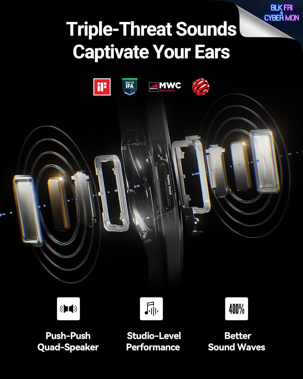 [Studio-Level Acoustic]: World’s first AR Glasses with Push-Push Quad-Speaker design like the pros do, bringing unparalleled 400% better dynamic stereo sound with crystal-clear highs, detailed mids, and stronger bass, and making the more-than-VR experience more engaging.