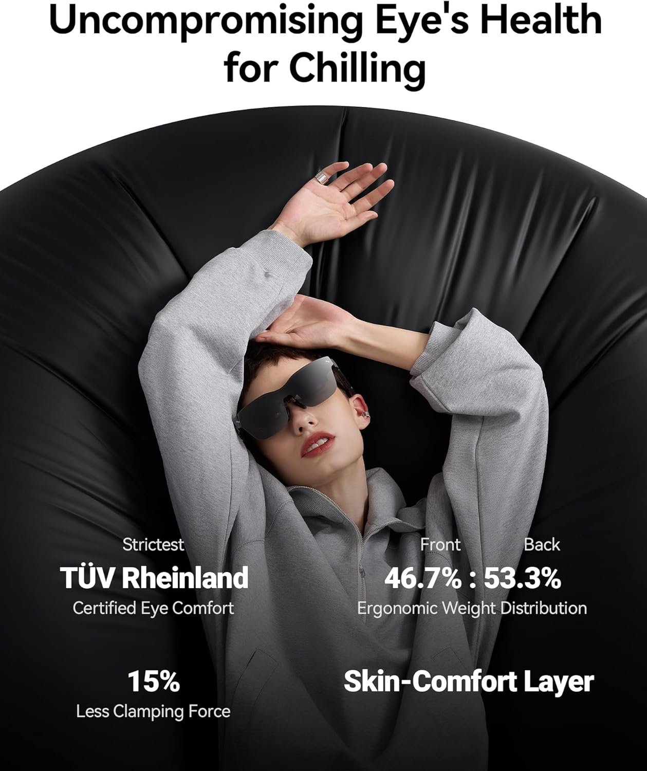 [Portable & Comfortable]: The ultimate 9-point FlexiFit of temples and nose pad provides multiple adjustments to snug your face stably and comfortably. The skin-comfort layer grants a softer, refined fit. All in all, these lightweight AR glasses are ergonomically ideal for lying while watching movies or gaming.