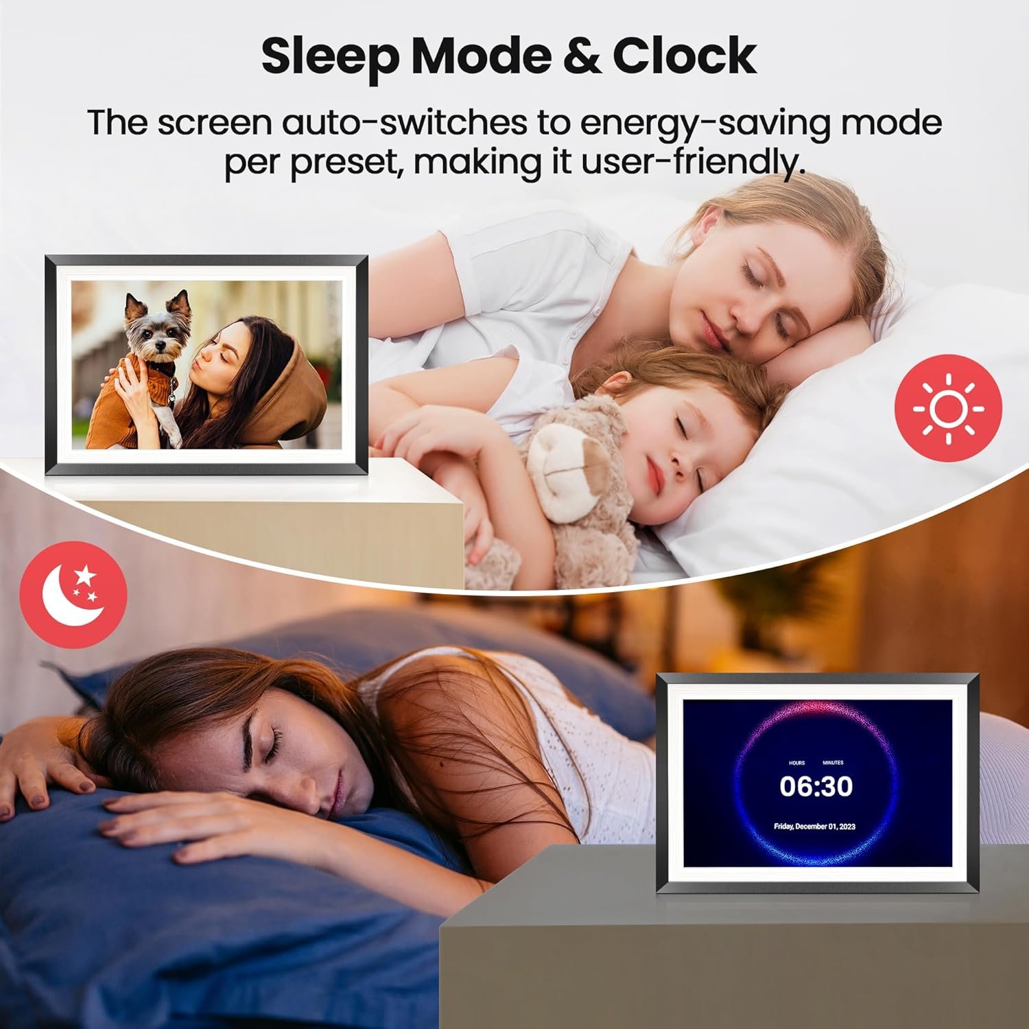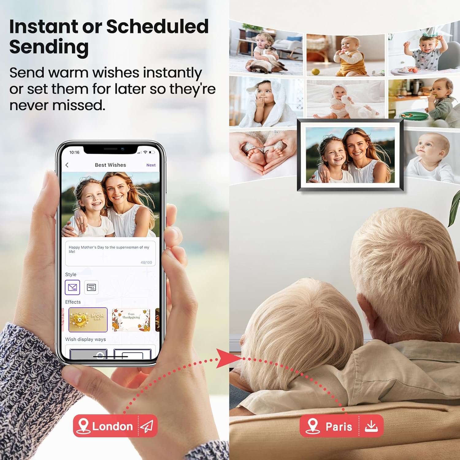 5.Heartfelt Present for Your Loved One – Perfect to share various occasions such as birthdays, weddings, graduation ceremonies, Mother’s Day, Father’s Day, Christmas, family gatherings, and more. All your precious and beloved moments with family and friends can be recorded and displayed on the 10.1-inch HD Auto Rotate Photoshare frames so they’re no longer confined to your phone.