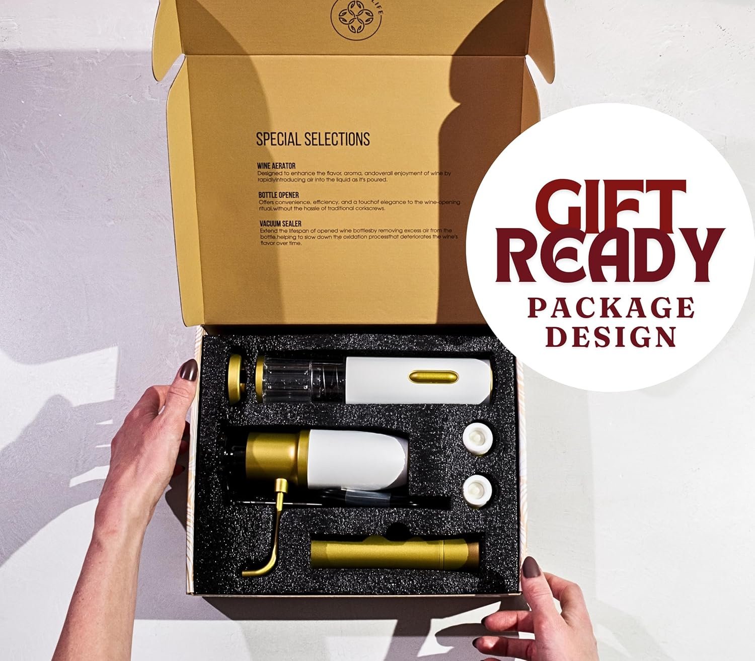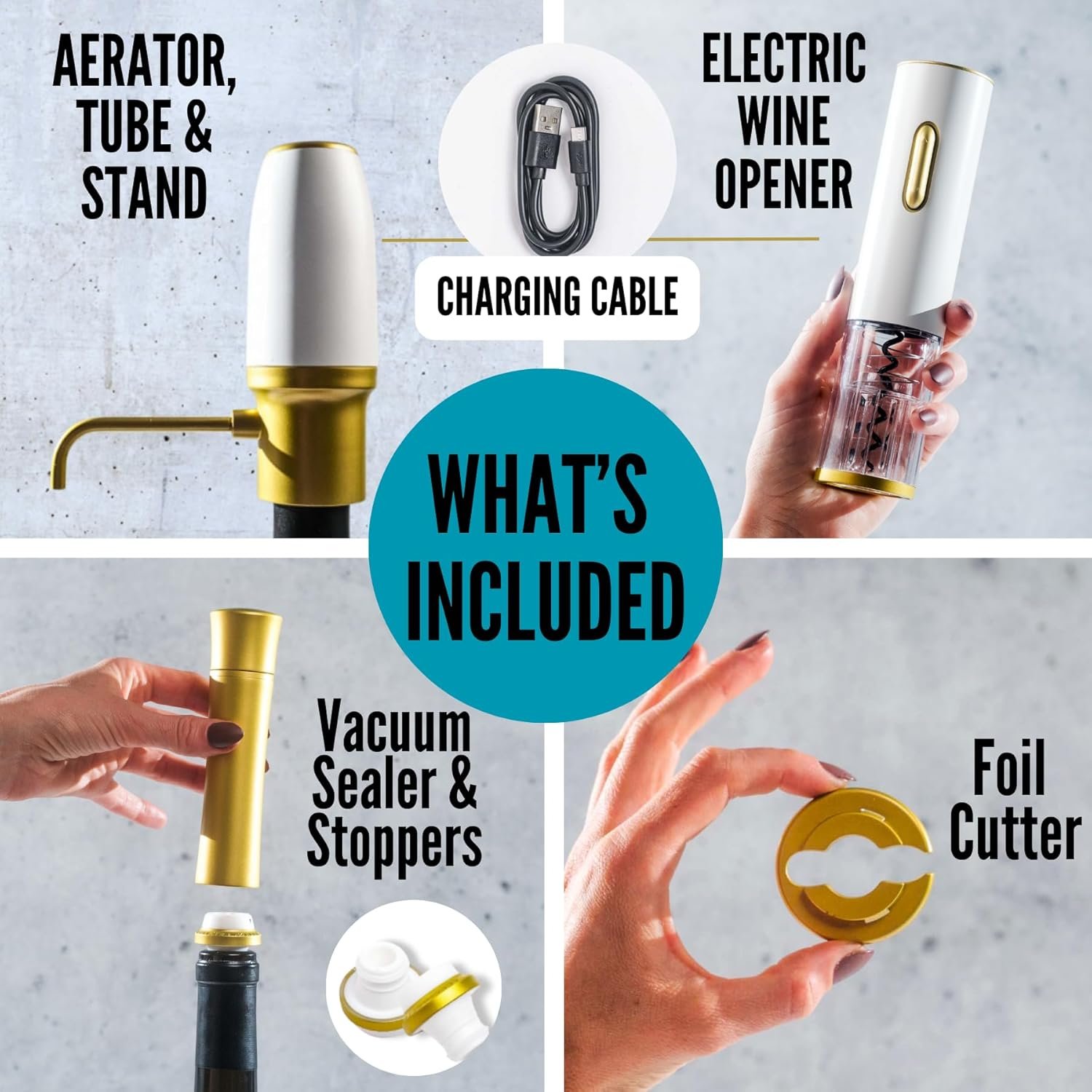 ALL-IN-ONE WINE SET GIFT: Our electric wine corkscrew set with complete wine accessories has everything you need from effortlessly opening the bottle to preserving any leftover wine. Our foil cutter, electric corkscrew wine opener, wine air aerator and vacuum sealer with stoppers makes every step simple. 5-in-1 electric wine bottle opener set has custom packaging designed with gift giving in mind for Mother’s Day gift, Father’s Day gifts, gifts for wine lovers.