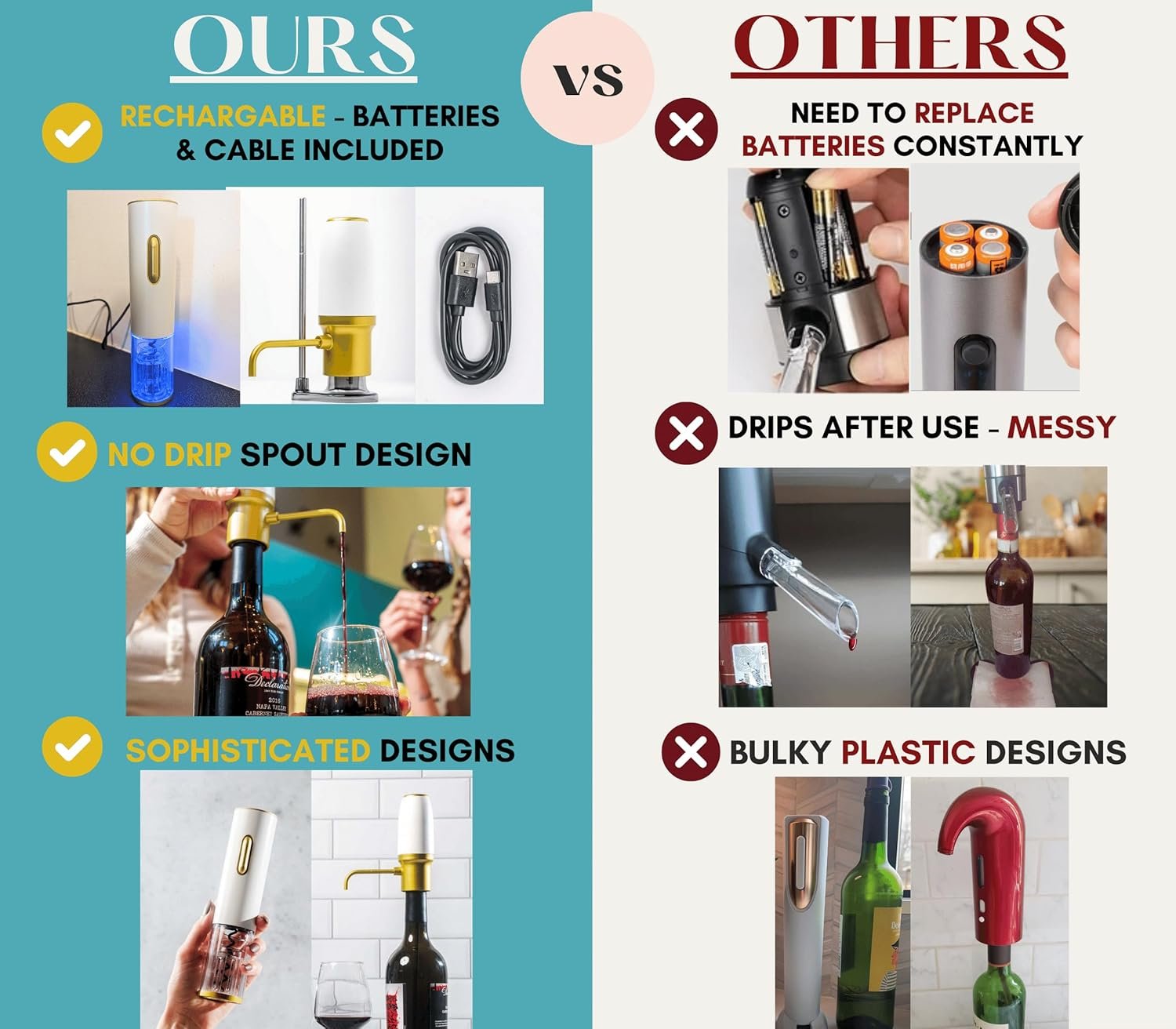 NO BATTERIES NEEDED: No need to worry about batteries – our automatic wine bottle opener & wine dispenser have rechargeable built-in ones. With a rechargeable mechanism, it ensures a reliable and cordless operation. Making your downtime as relaxing as possible with our dispensador de vino.