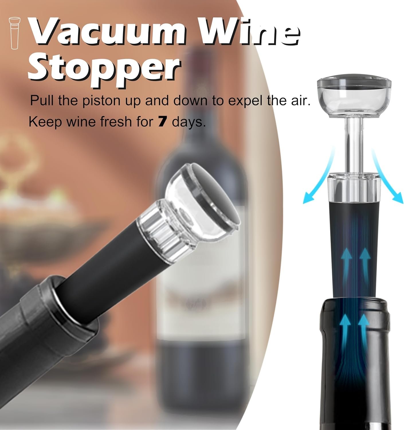 Vacuum Wine Stopper : Pump to remove air from wine bottle. Keep your wine fresh for up to 7 days with our wine stopper, making you enjoy the wine whenever you want without any waste