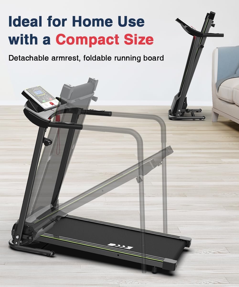 【Suitable for Home Use】 If there are other members of the family who want to use it and feel that the armrest is a little restrictive, it can be removed, which does not affect use. And after disassembly, the treadmill can be folded. What’s more, this portable treadmill can be moved from room to room with its transportation wheels. The folded size doesn’t take up much space.