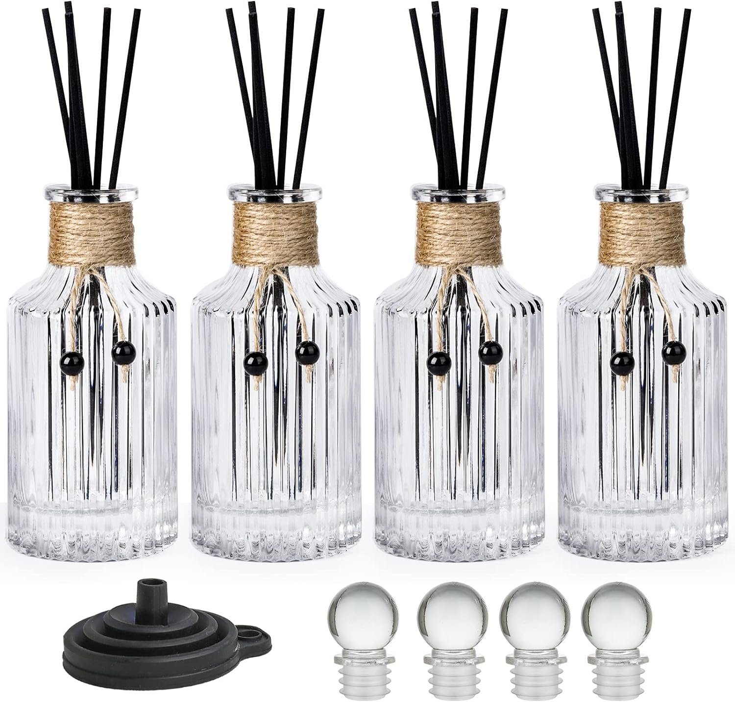 【Items in the Package】4 diffuser glass bottles+1 funnel for pouring liquids+4 glass stoppers+reed sticks +twine+beads for DIY. Note: They are unassembled.