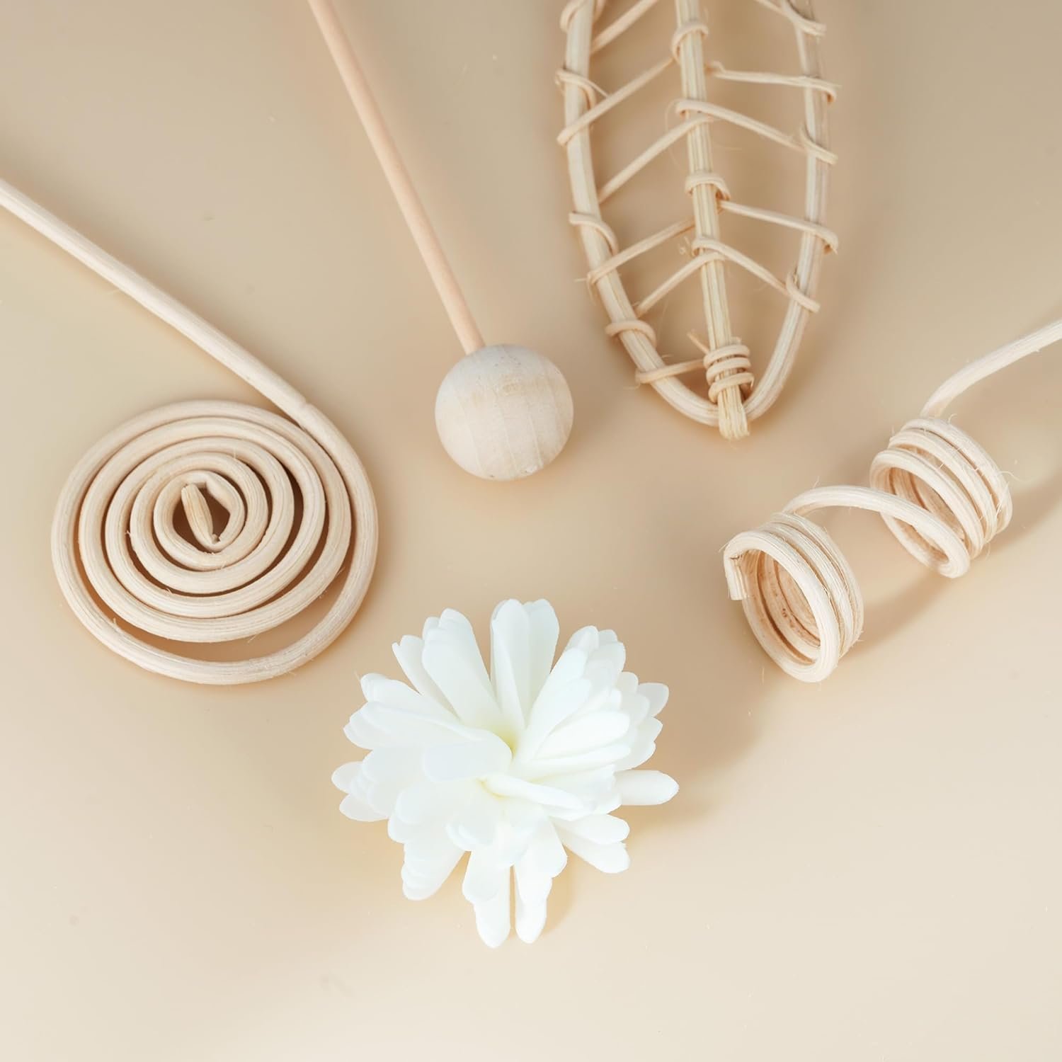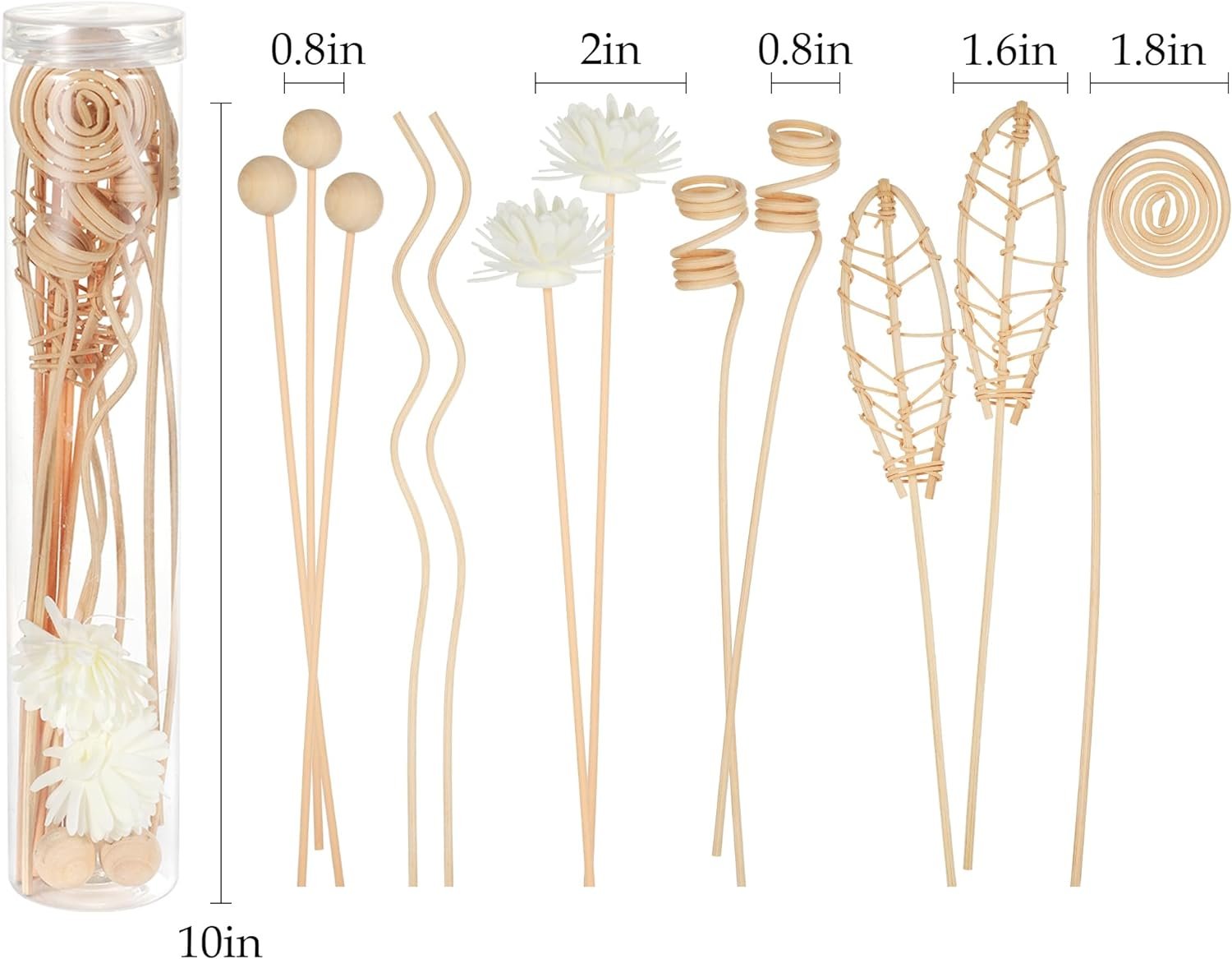 【Diffuser Stick Set】: You will receive 12pcs diffuser reeds sticks with various style , about 11 inch in length,including 2pc hand made artificial white flower,3pcs wood ball Sticks,7pcs shaped scent sticks