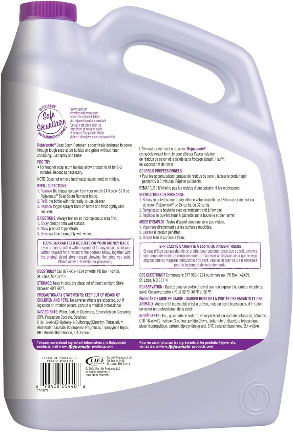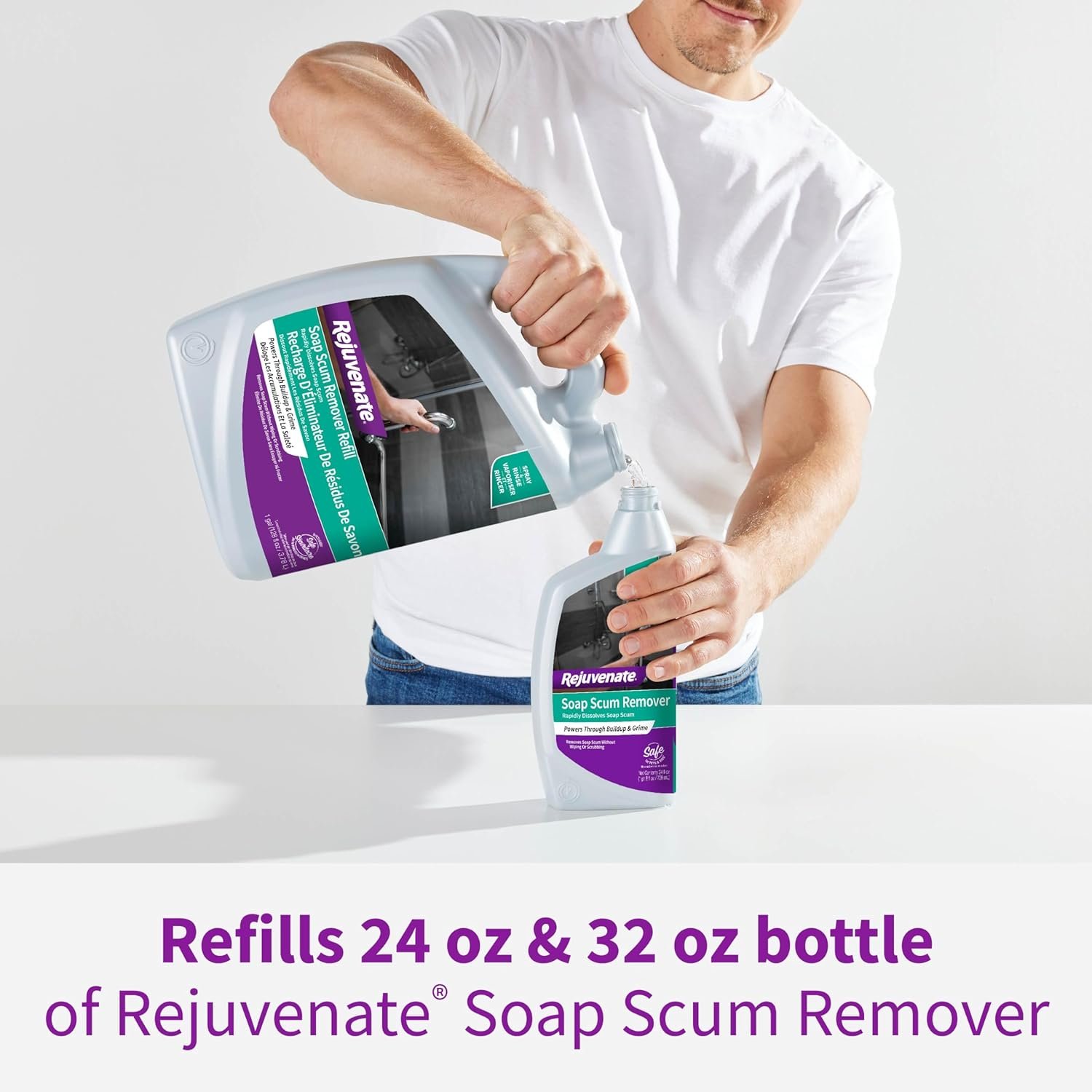 Rejuvenate Soap Scum Remover Refill is specifically designed to power through tough soap scum buildup and grime without harsh scrubbing. Gentle enough for daily use, this non-bleach, non-abrasive formula is safe on glass showers and multiple surfaces, including ceramic tile, chrome, plastic and fiberglass. Simply spray and rinse to easily remove soap scum. To refill, remove the trigger sprayer or Click n Clean bottle adapter from your empty 24 fl oz or 32 fl oz Rejuvenate Soap Scum Remover bottle/cartridge. Refill the bottle/cartridge with this ready-to-use cleaner. Replace trigger sprayer or Click n Clean bottle adapter and twist tightly until secured. Always test on an inconspicuous area first. Spray directly onto wet surface. Allow product to penetrate. Rinse surface thoroughly with water. For tougher soap scum buildup, allow product to sit for 2-3 minutes. Repeat as necessary. NOTE: Does not remove hard water stains, mold or mildew.
