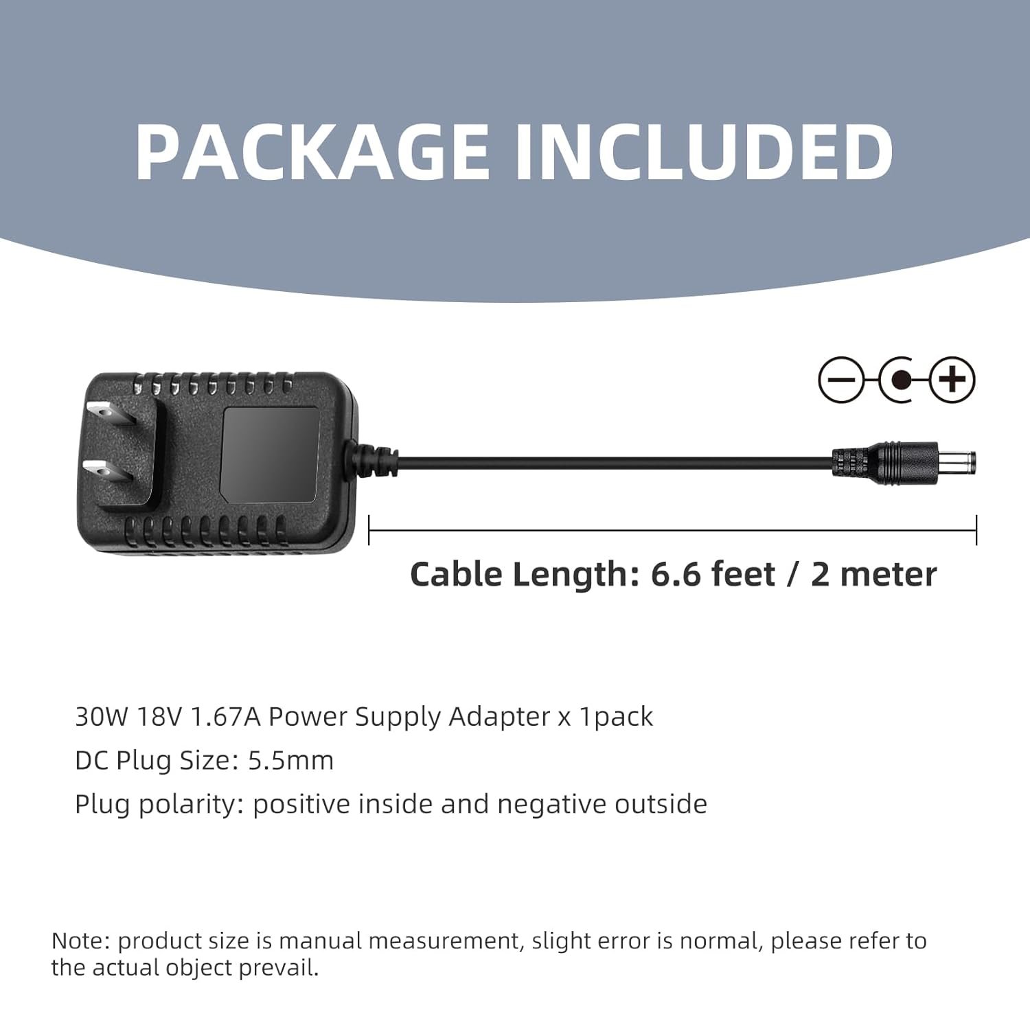 5. Package includes: 30W 18V 1.67A Power adapter x1, cable length: 6.5 ft / 2 m.
