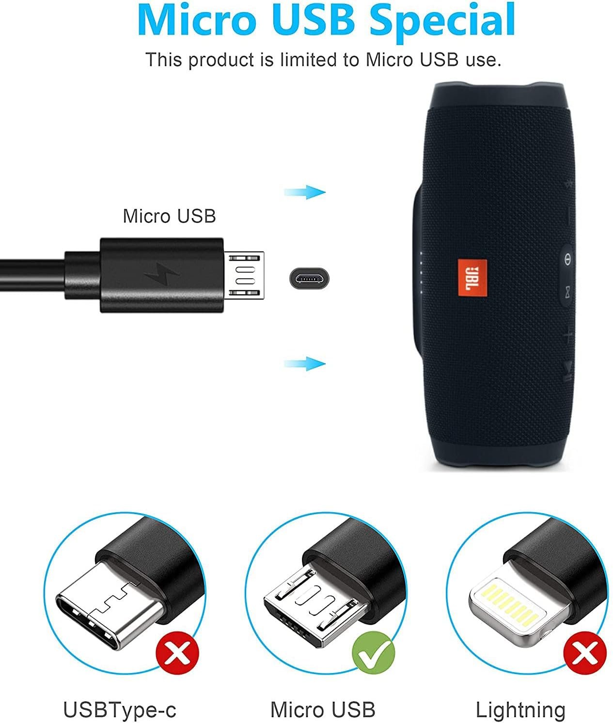 Replacement Charging Cable and Spare Cable: Compatible with USB port chargers, wall chargers, multi-port charging stations, and mobile power sources, it’s the perfect replacement for your lost charging cable. Charge your JBL portable Bluetooth speaker with a wall charger, portable charger, or multi-port USB charger