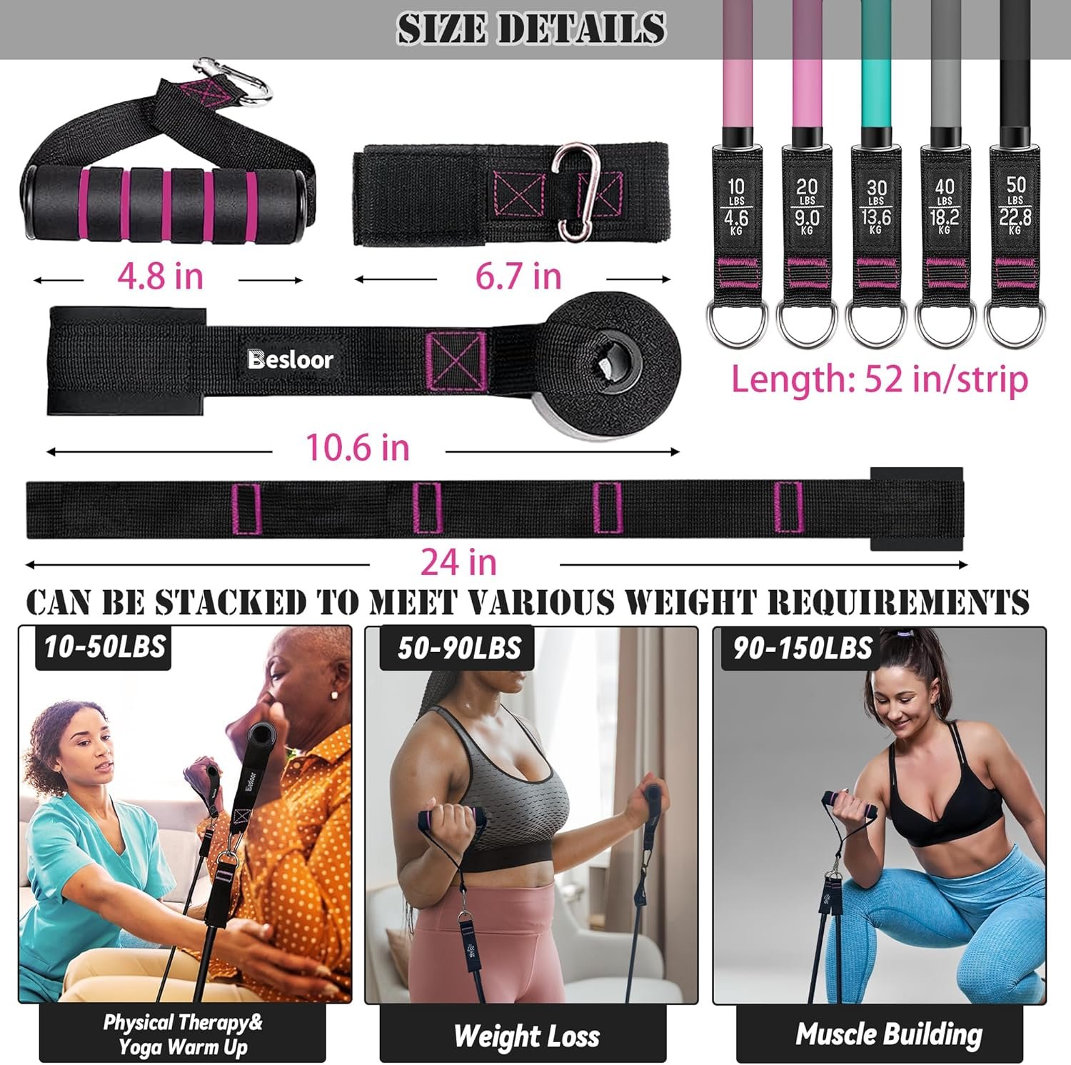 💝【Varying Resistance Levels】 These 5-piece stackable bands come in different resistance levels:light pink(10 lbs.), pink(20 lbs.), green( 30 lbs.), gery(40 lbs.),purple(50 lbs.), which can be used alone stacked in any combination to a maximum equivalent of 150 lbs. Whether you are a fitness enthusiast or a beginner, this set can meet your workout needs.