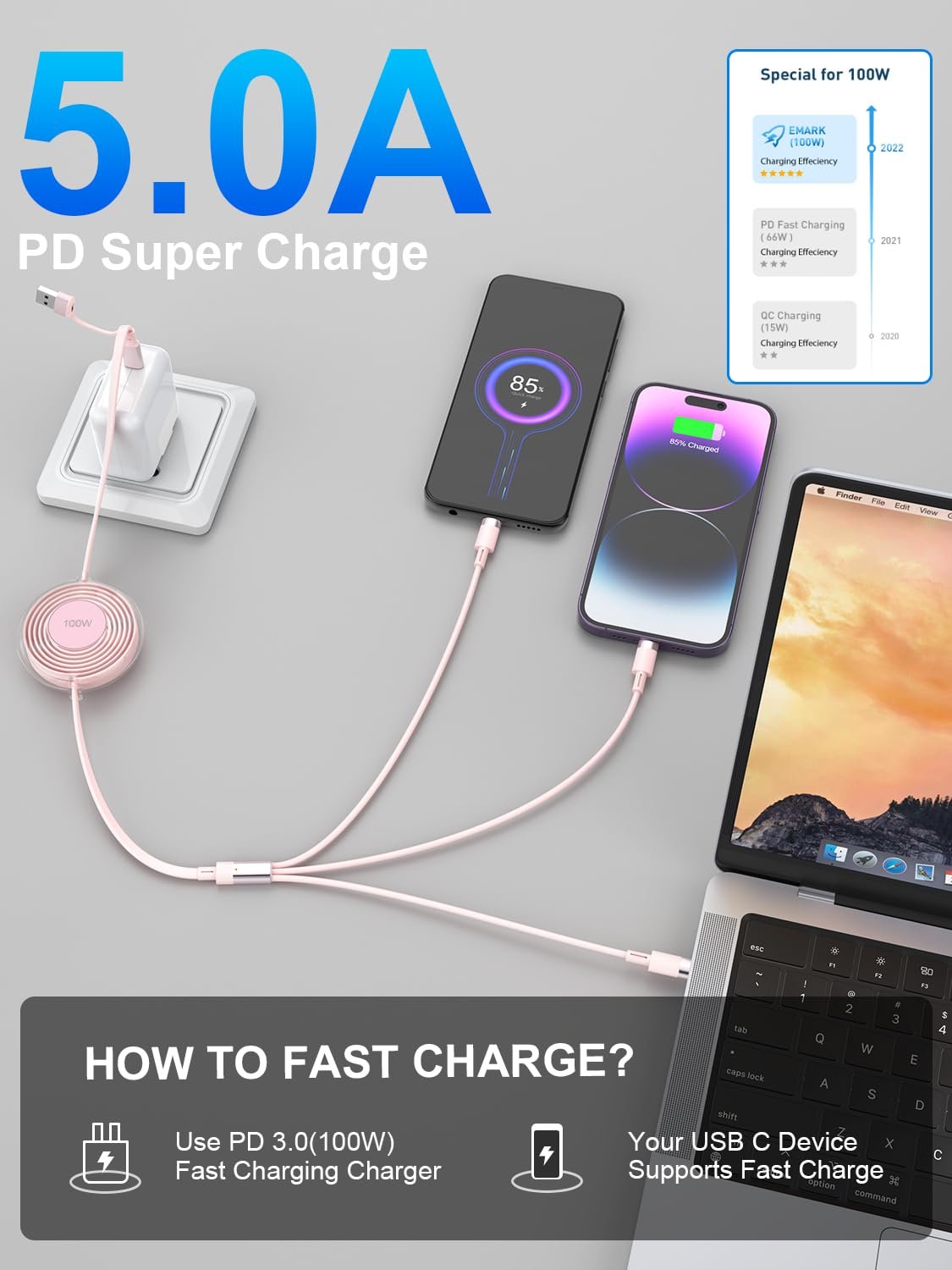 🚀【Real 100W Retractable Phone Charger】Upgrade fast charging retractable charging cable adopts a unique dual smart chips design, providing the fastest available current up to 5A (USB C to USB C cable support 100W), and the charging speed is increased by 60%. Besides, new design also prevents overheating and overcharging, keeping you and your device safe. Quckly full your cellphone or Macbook, The Type-c port also support data transfer with 480Mbps, and support Carply for your iphone 15