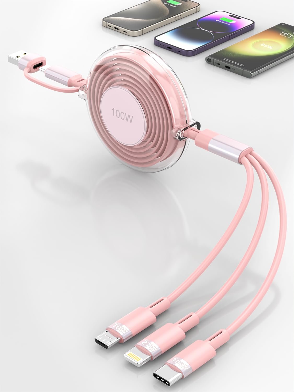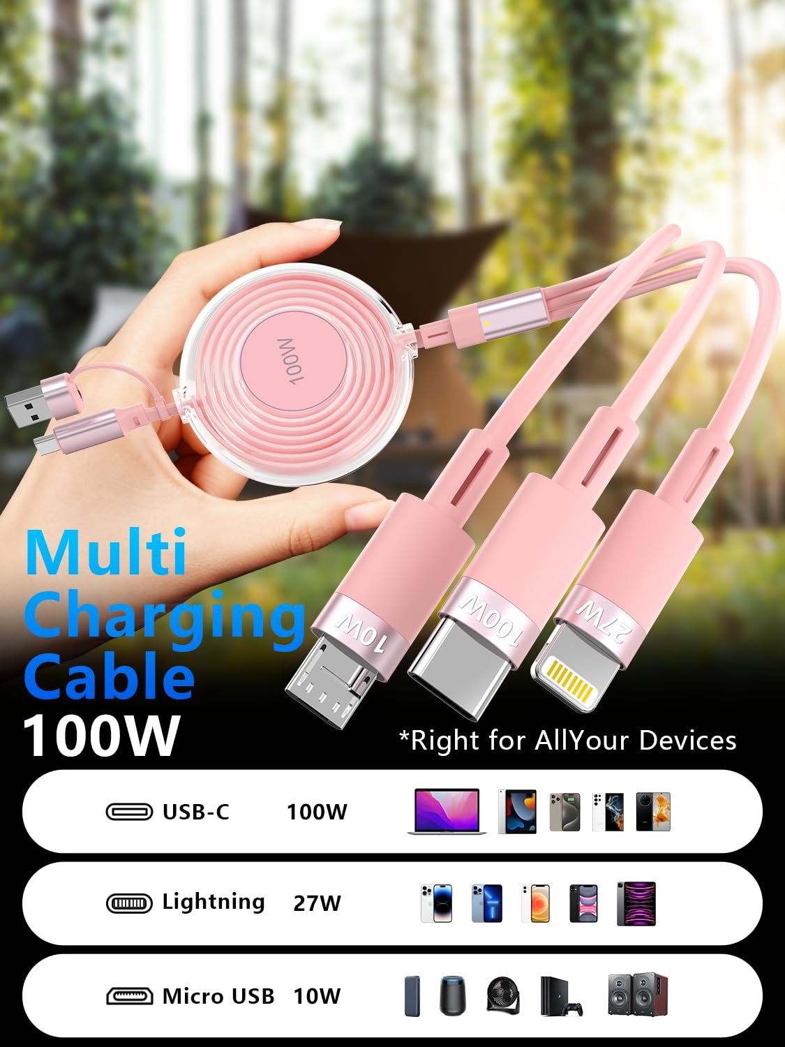 🎁【Retractable 100W Multi Charger Cord】Cost-Effective retractable usb c 5 in 1 cable can satisfy multiple charging demands for you. Dual USB+ USB-C connectors , C to C support 100W, retractable usb c to lightning cable for 27W Fast charging and 10W Micro USB ports. can fit all android and apple devices, whatever with USB wall charger or USB-C charger, it is universal multiple charging cable for you in anywhere use