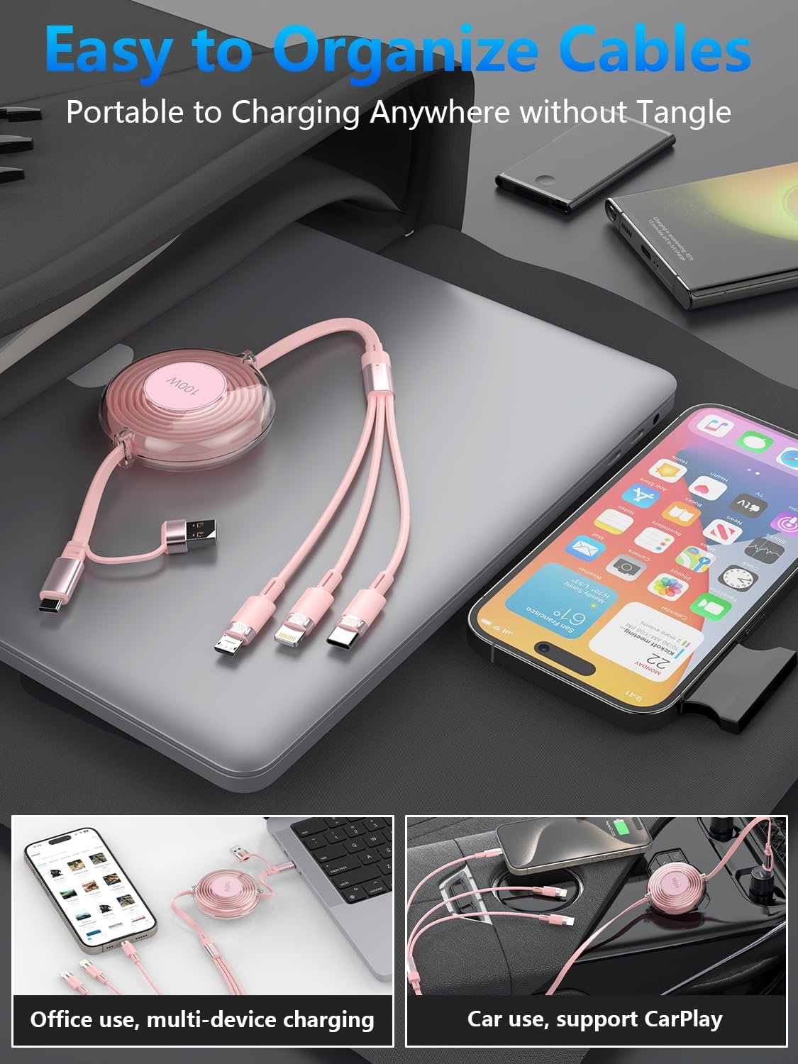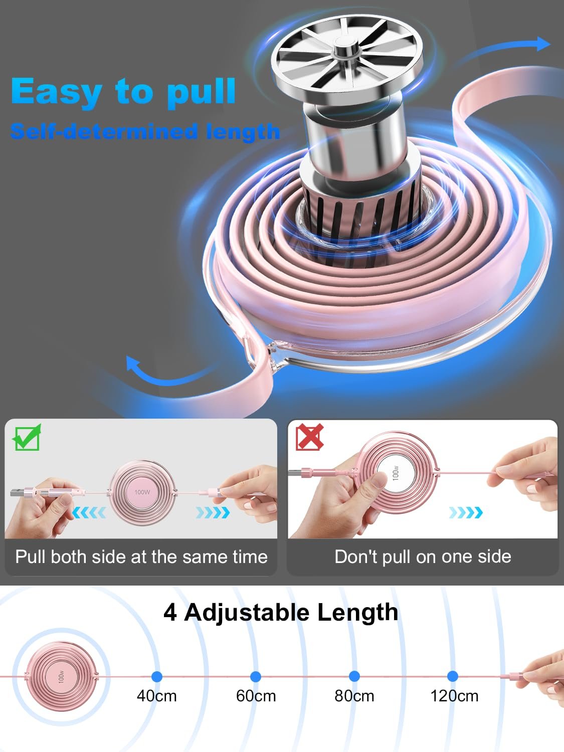💚【5 Retractable Length Multiple Charging Cable】The 100W retractable multi charging cable can extend from 1.5ft to 4ft and adapts to different daily situations.adjustable Lengths: 0.66ft-1.6ft-2.3ft-3ft-4ft. Total Length 4ft/1.2M. Opluz retractable phone charger With a retractable design, you just pull out both ends of the cable at the same time, it will automatically retract to the original position. Easy to place in your handbag, laptop bag, or pocket. This multi charging cord Cut down on clutter and save some space