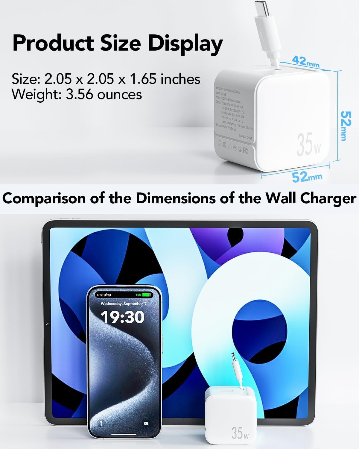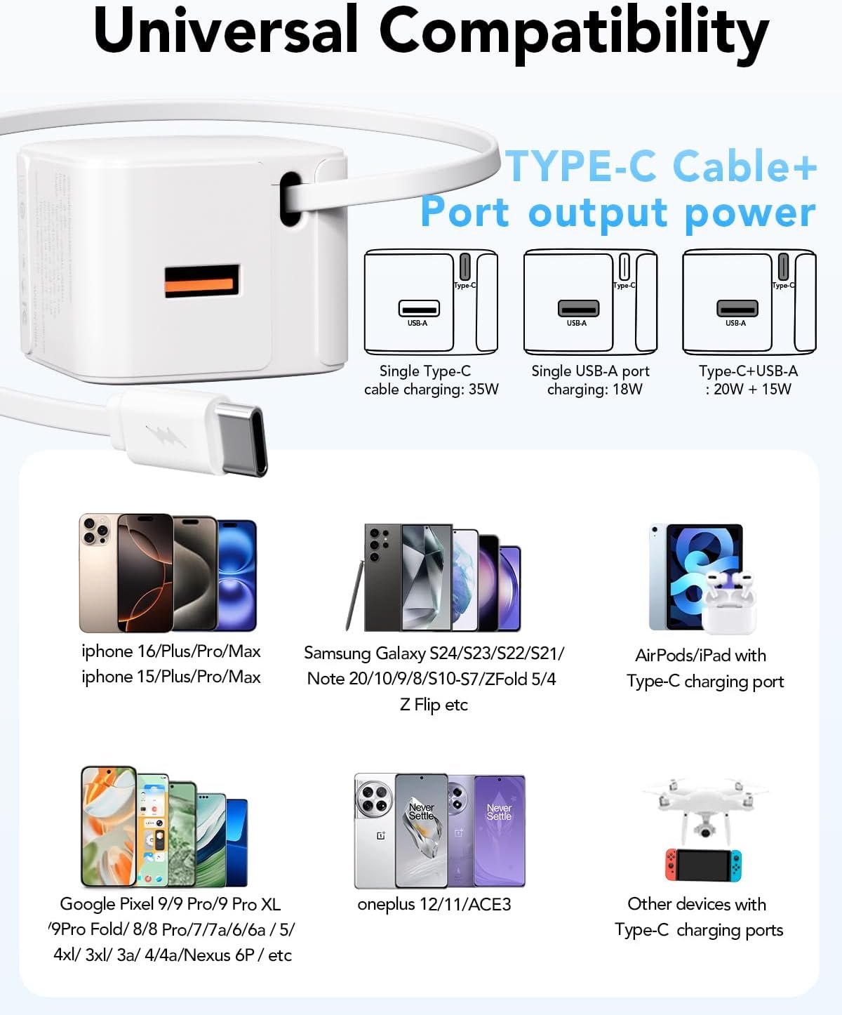 [35w Fast Charging for 2 Devices] The retractable phone charger wall plug has a USB-A port and a Type-C retractable cable for charging 2 devices at the same time.Provides up to 35W of fast charging capability that is stable and efficient.