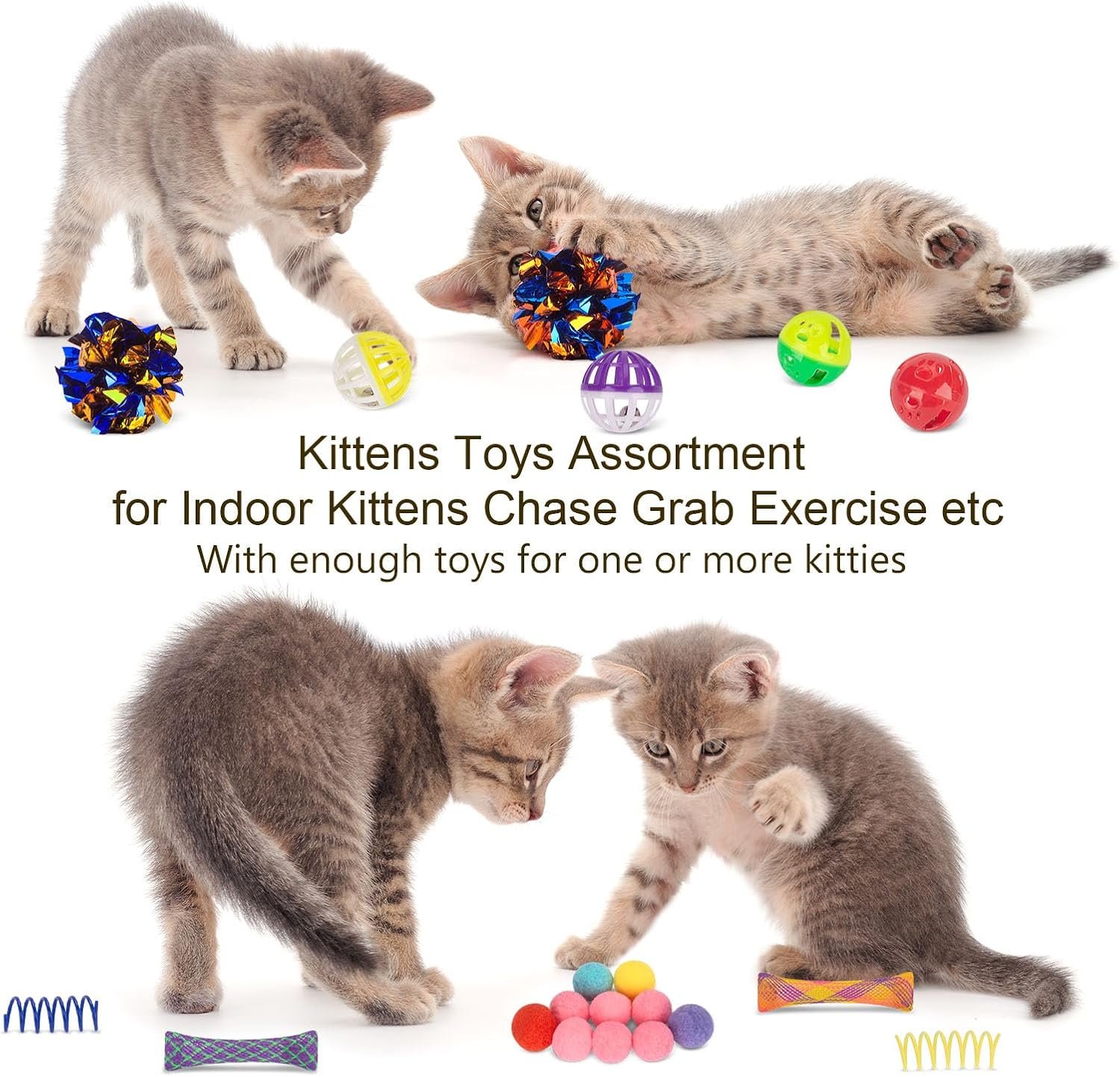 Value Pack: 33 Pcs cat toys,including: 2 cat tunnels,1 teaser wand,2 cat springs,2 cat spring tubes,2 mouse toy with feather,2 crinkle balls,2 rainbow balls,10 Pompom cat toy,2 cat quiet balls,4 cat ball with bell inside,2 sponge toy with feather,2 dumbbell column ball toys