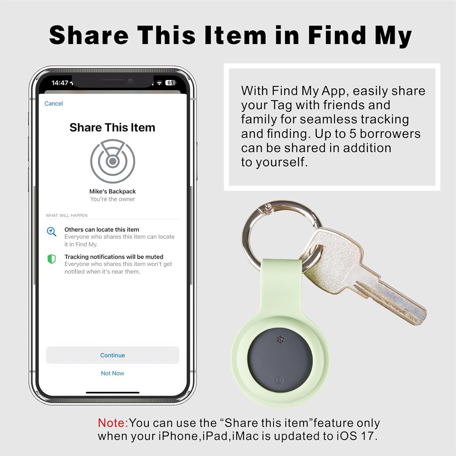 【Share This Item】: New function for iOS 17. You can share items in Find My with up to 5 borrowers, allowing them to see the item’s location on a map. Borrowers won’t receive tracking notifications as the item moves with them. Make sure your iOS device is updated to iOS 17.