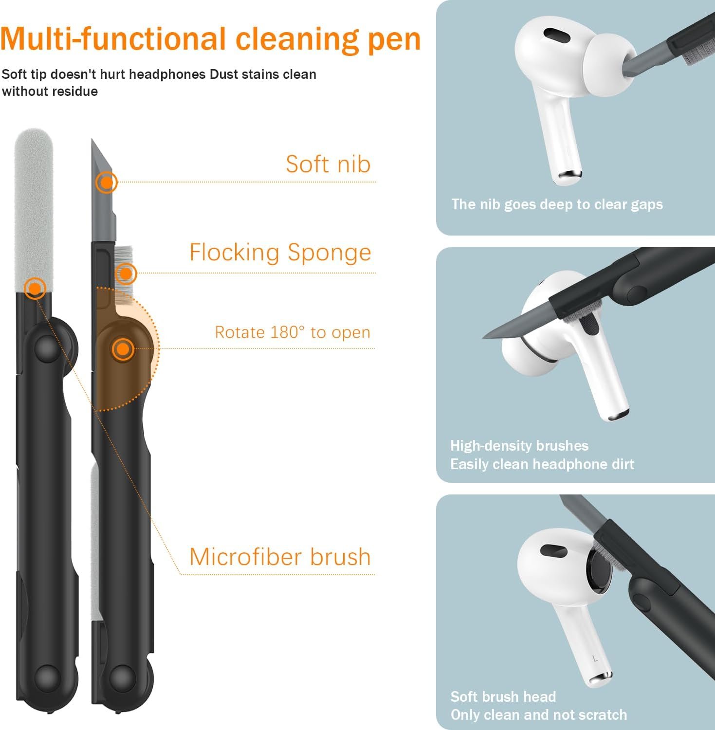 Multi-functional Cleaning Pen: The Airpod cleaning Kit has Silicone nib to remove dirt from hidden cracks and holes. The soft flocked sponge absorbs fine dust inside the wireless earbuds charging case. The high-density brush can easily clean the dirt on the sound hole of the earphone.