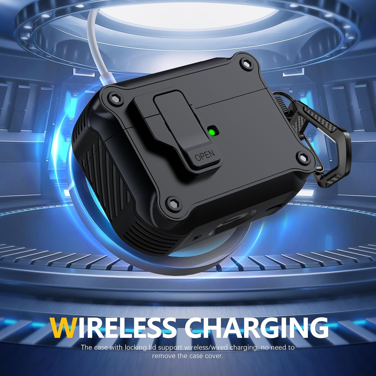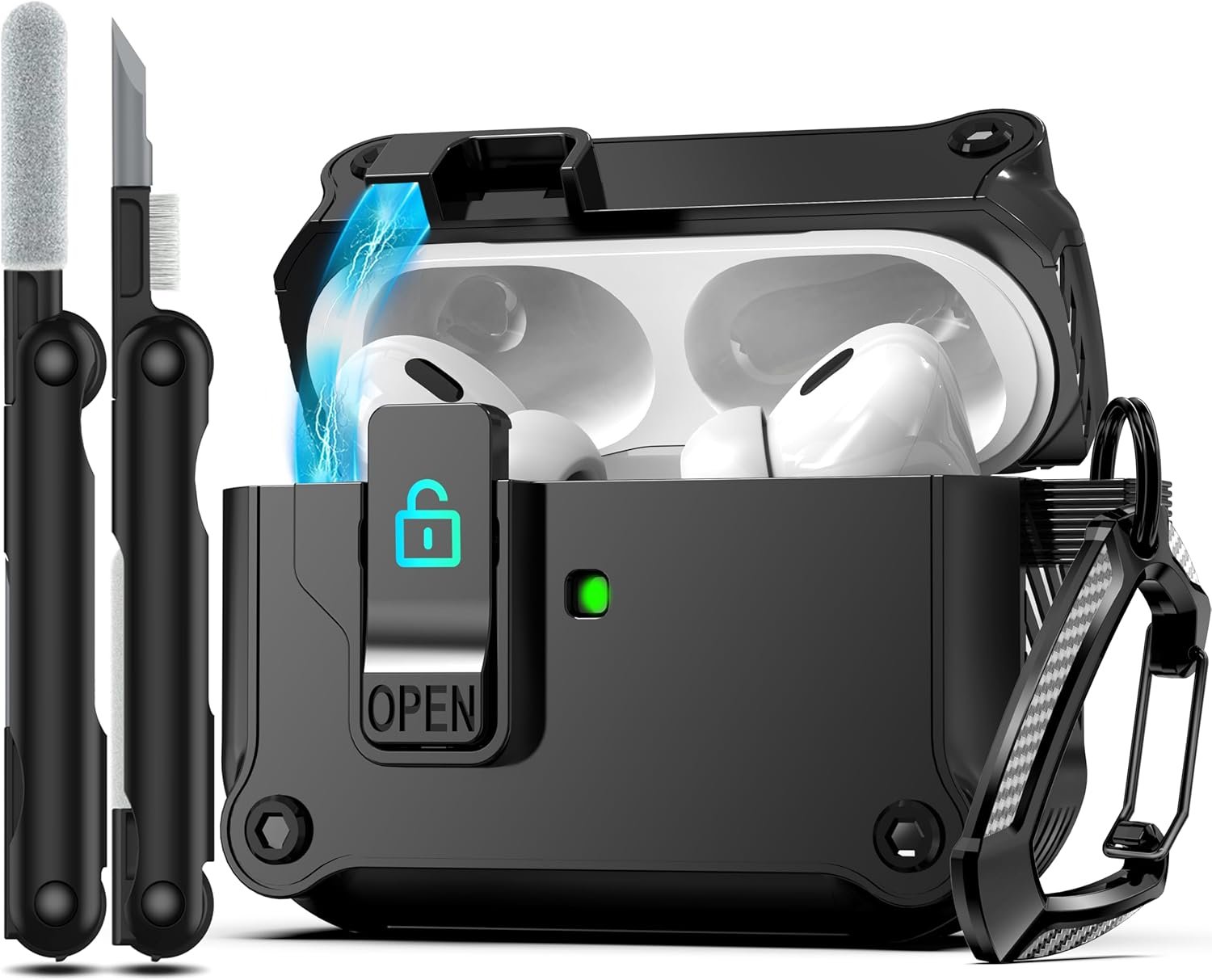 【Unique Security Lock & Automatic Pop-up】 Upgraded security lock design makes it easier to open and close.Press the “OPEN” button, the top of the case will automatically pop open. Keeps the for AirPods charging case well closed and ensures that the cover never falls off.