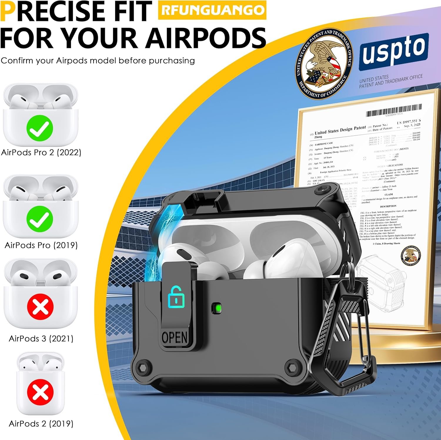 RFUNGUANGO for AirPods Pro 2nd/1st Generation Case Cover with Secure Lock Clip,Automatic Pop-up Case Full-Body Shockproof Hard Protective Cover for AirPods Pro 2 Case(2023/2022/2019) – Black