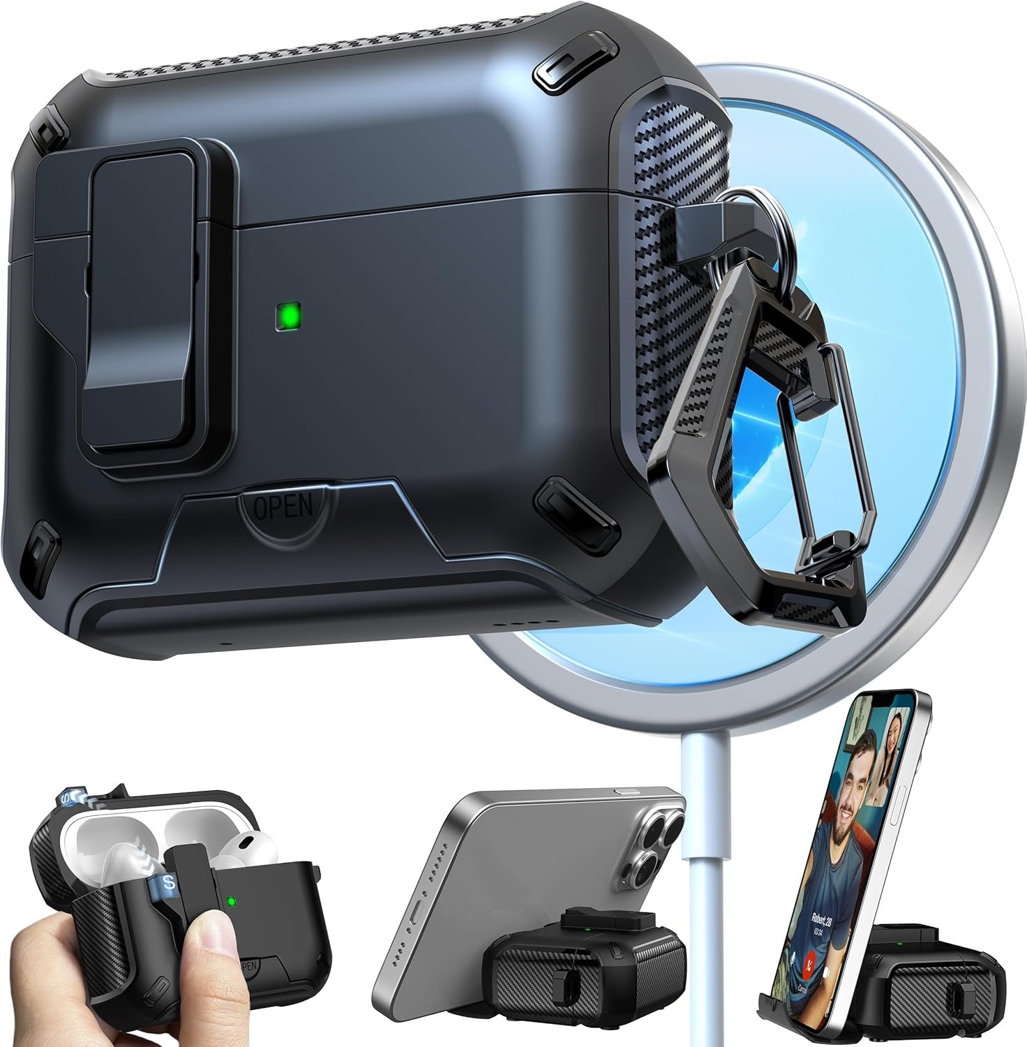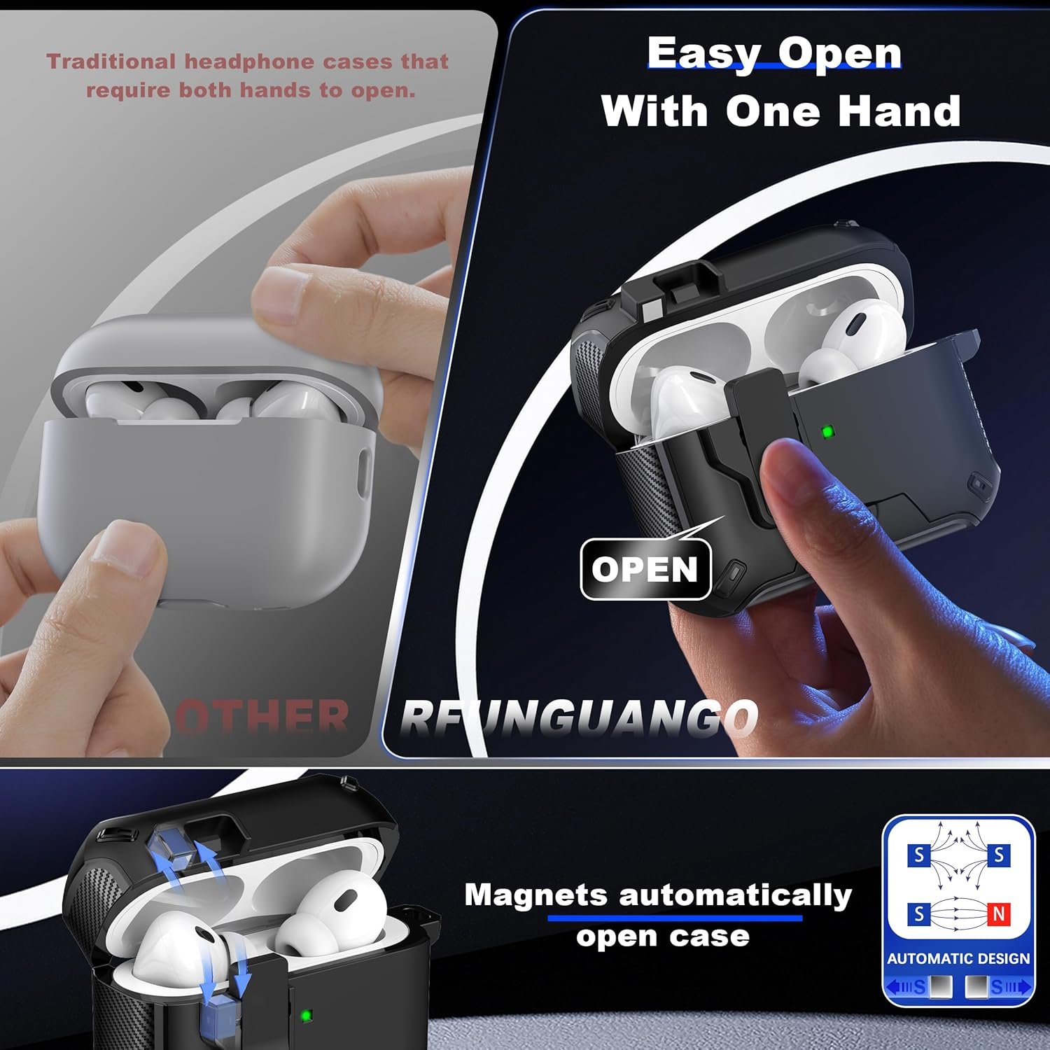 【Unique Security Lock & Automatic Pop-up】 Upgraded security lock design makes it easier to open and close.Press the “OPEN” button, the top of the case will automatically pop open. Keeps the AirPods charging case well closed and ensures that the cover never falls off.