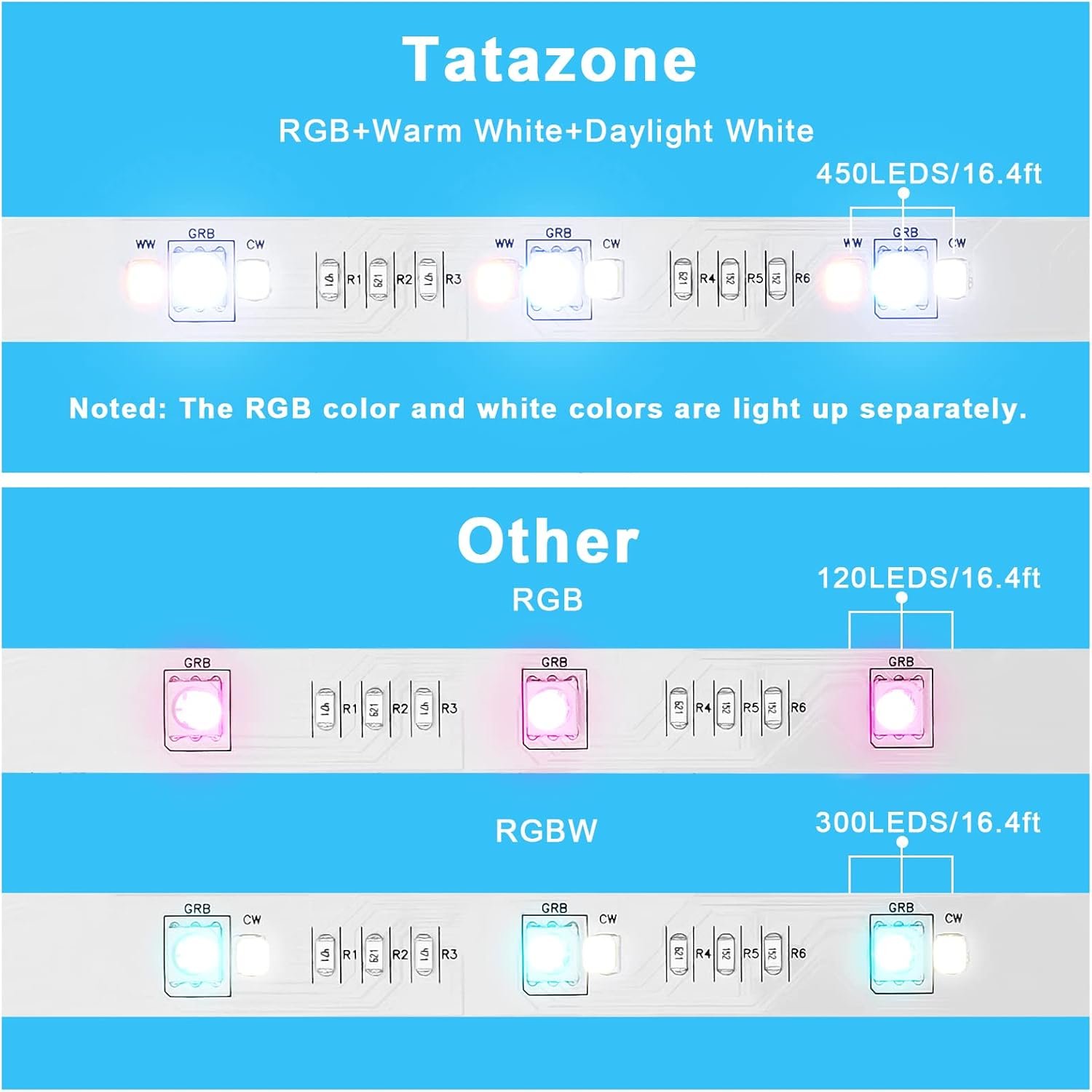 Make Your Home Smarter: The rgbcw led strip light compatible with Alexa and Google device, turn on/off, color changing, dim the brightness via your voice; and groug multiple tatazone device together to perfrom a function.