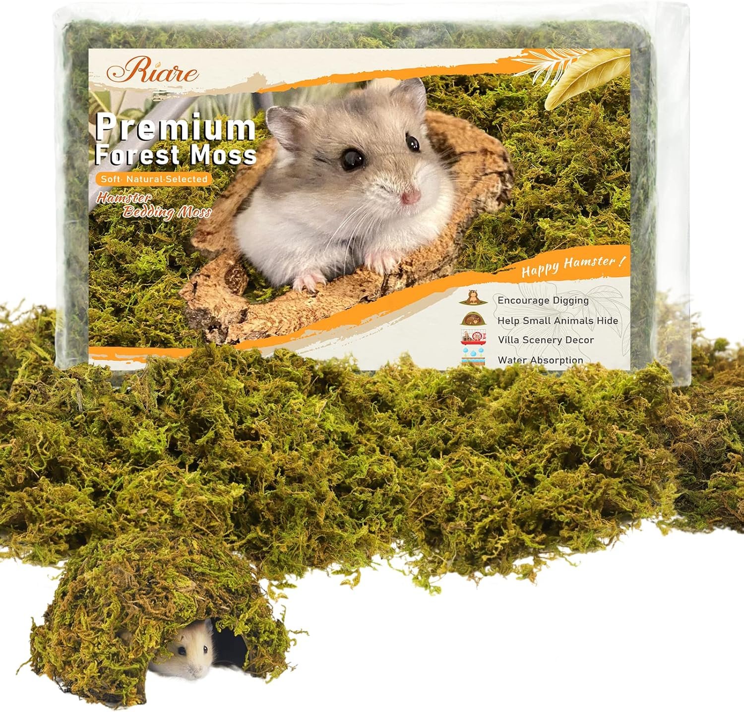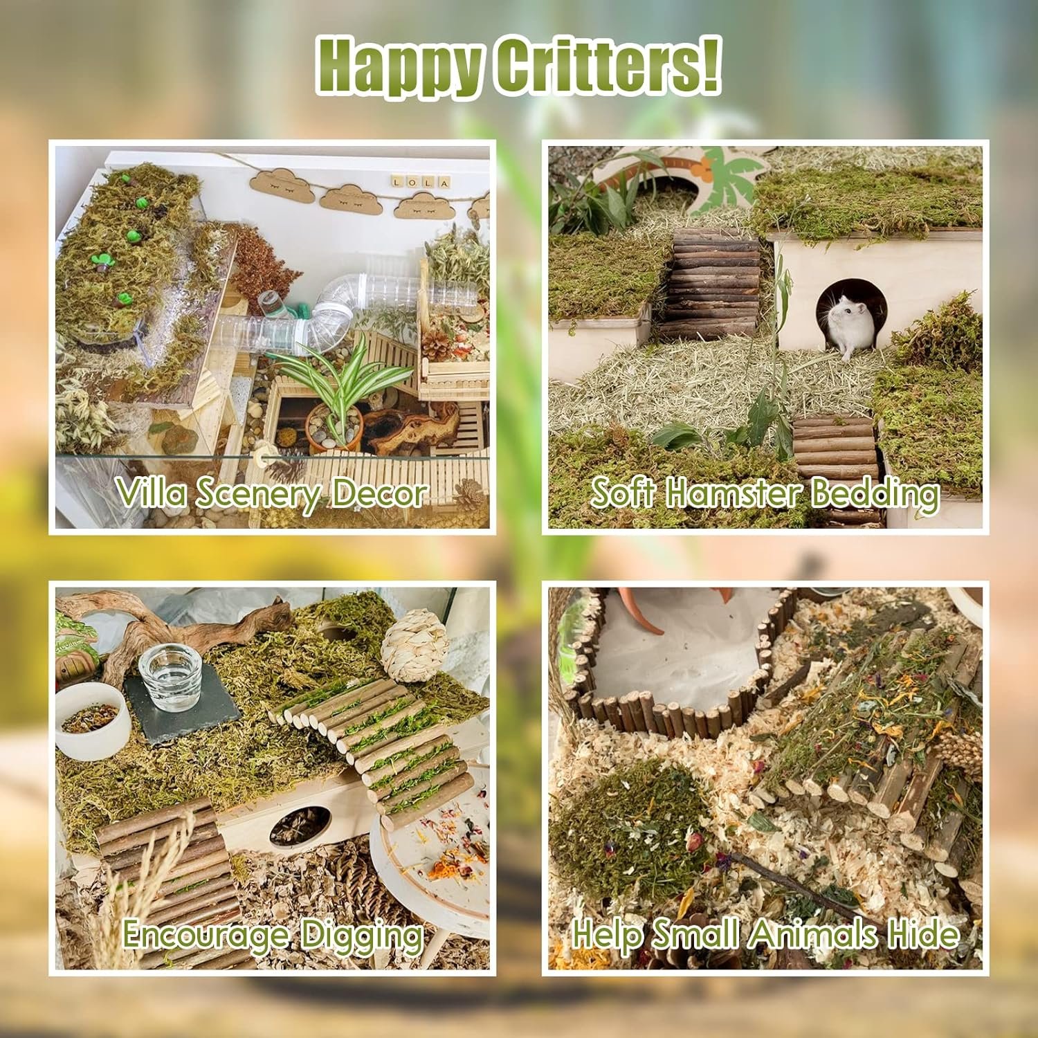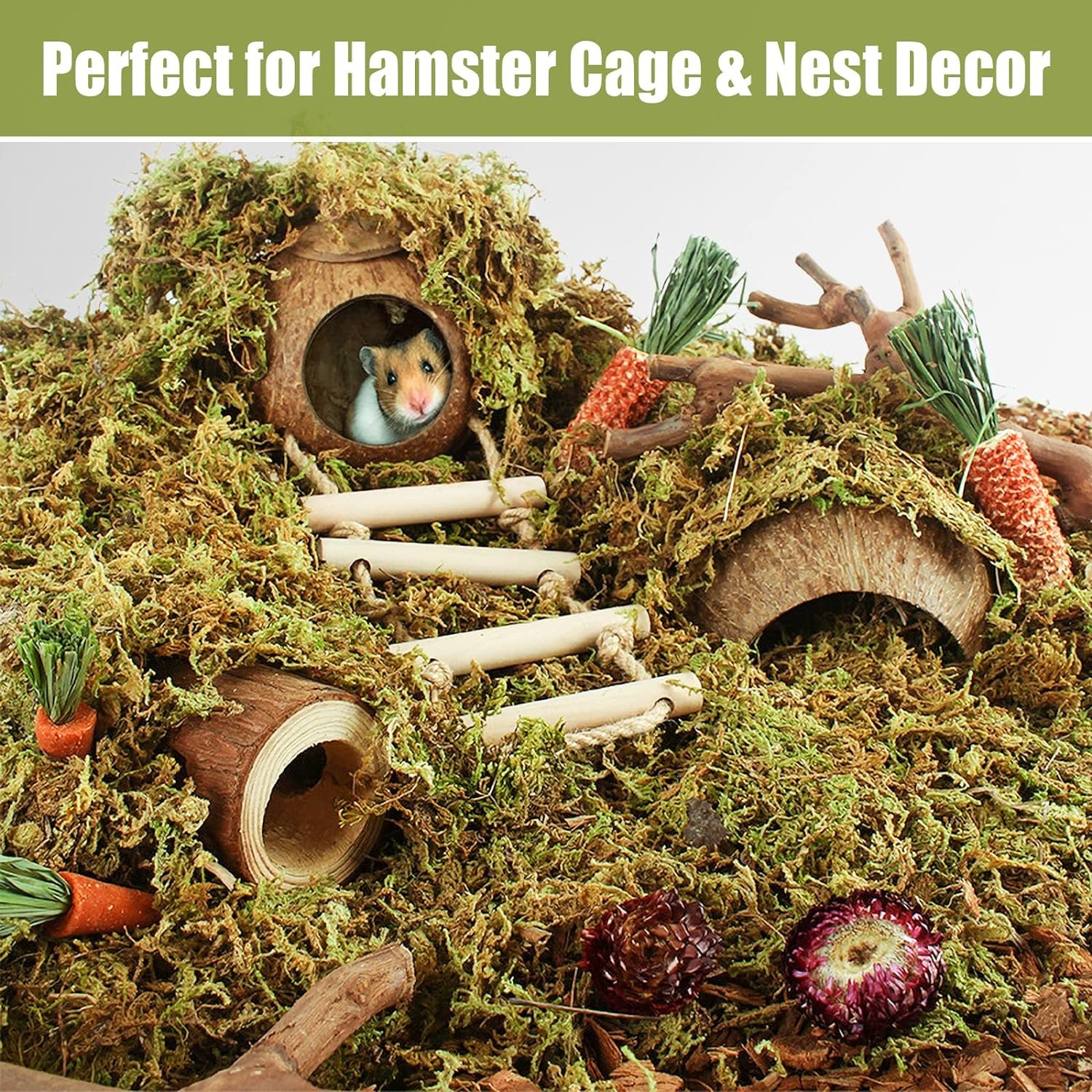 Moisture Control and Absorption: Our hamster moss is made of pure natural dried forest moss, clean and soft and smells pleasant, dry moss material can help absorb odors and excess moisture in the habitat, your hamsters will love it, it makes their enclosures more interesting and natural