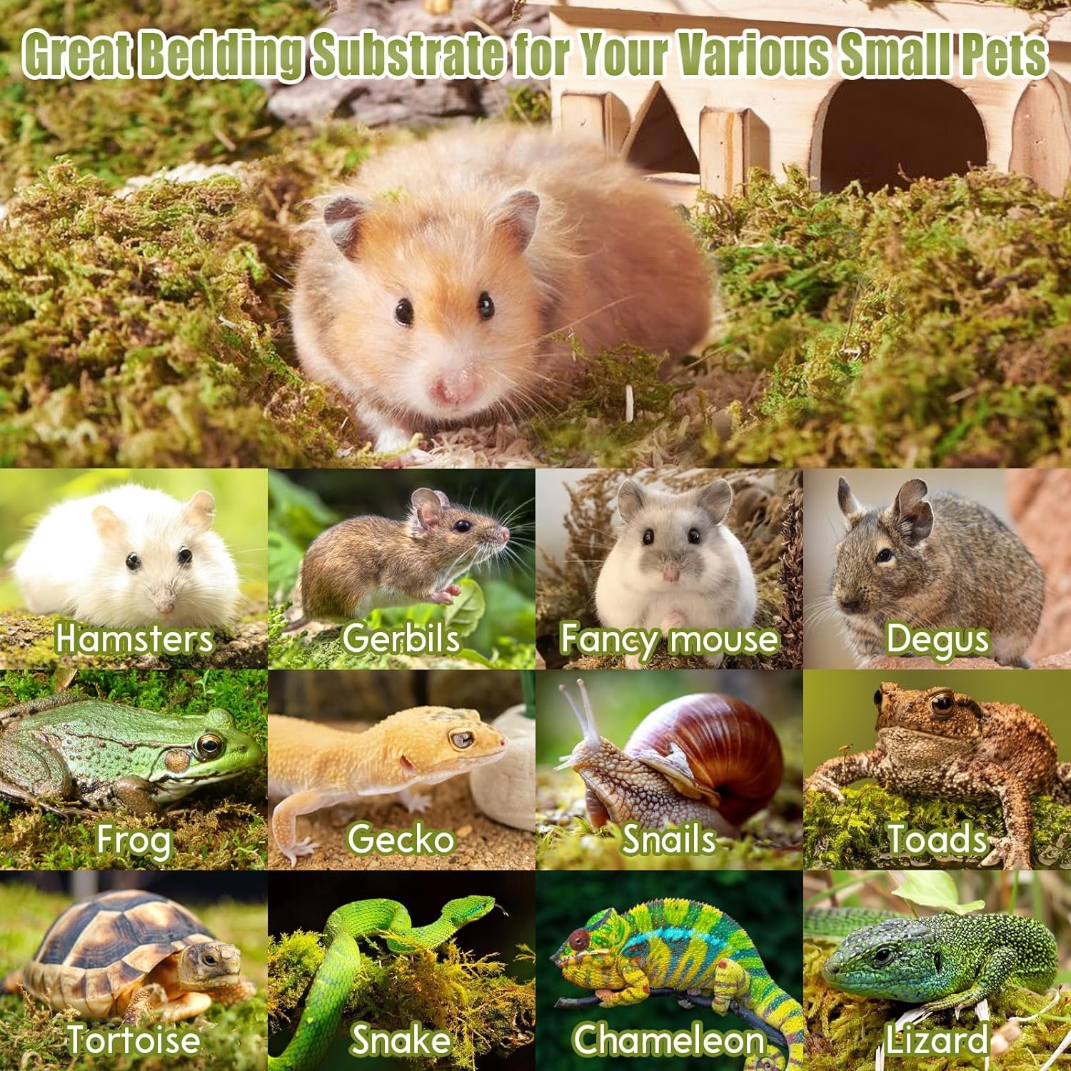 Great Moss Bedding for Small Animals: Our dried forest moss is suitable for rodents pets or small pets like hamsters, Gerbil, degus, frogs, etc, and other reptiles like lizards, geckos, chameleons, tortoises, snakes, snails, etc. Pet lovers are right to choose it