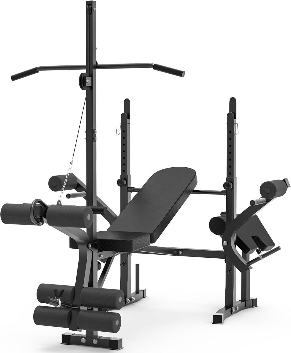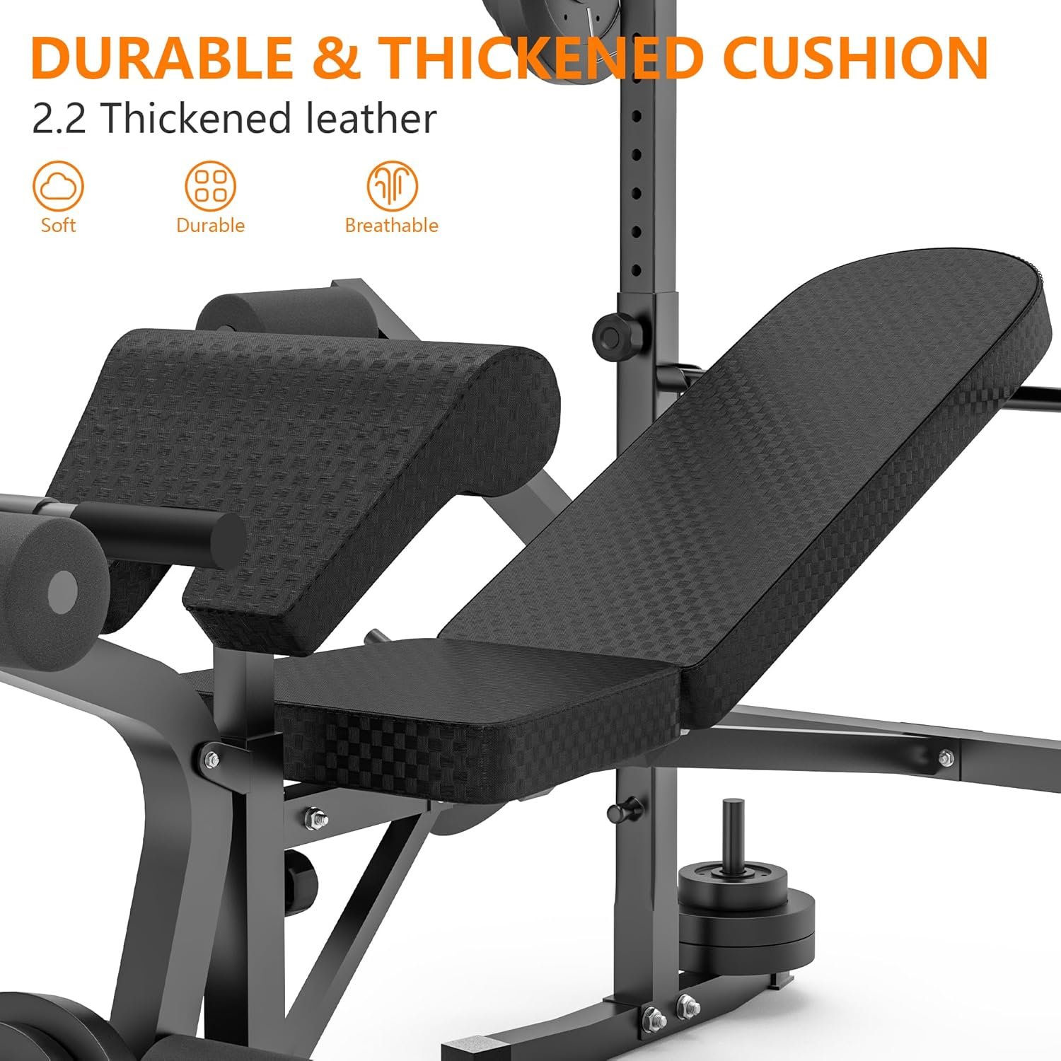 【Durable & Safe】 Rigel weight bench is equipped with a thick padded seat and backrest cushion to reduce impact and protect your body during exercise. Covered with breathable leather and padded with soft foam, the multi-function bench press with rack is wear-resistant and comfortable. Plus, the leg developer with 6 anti-tear PVC foam rollers can protect your legs and avoid injuries.