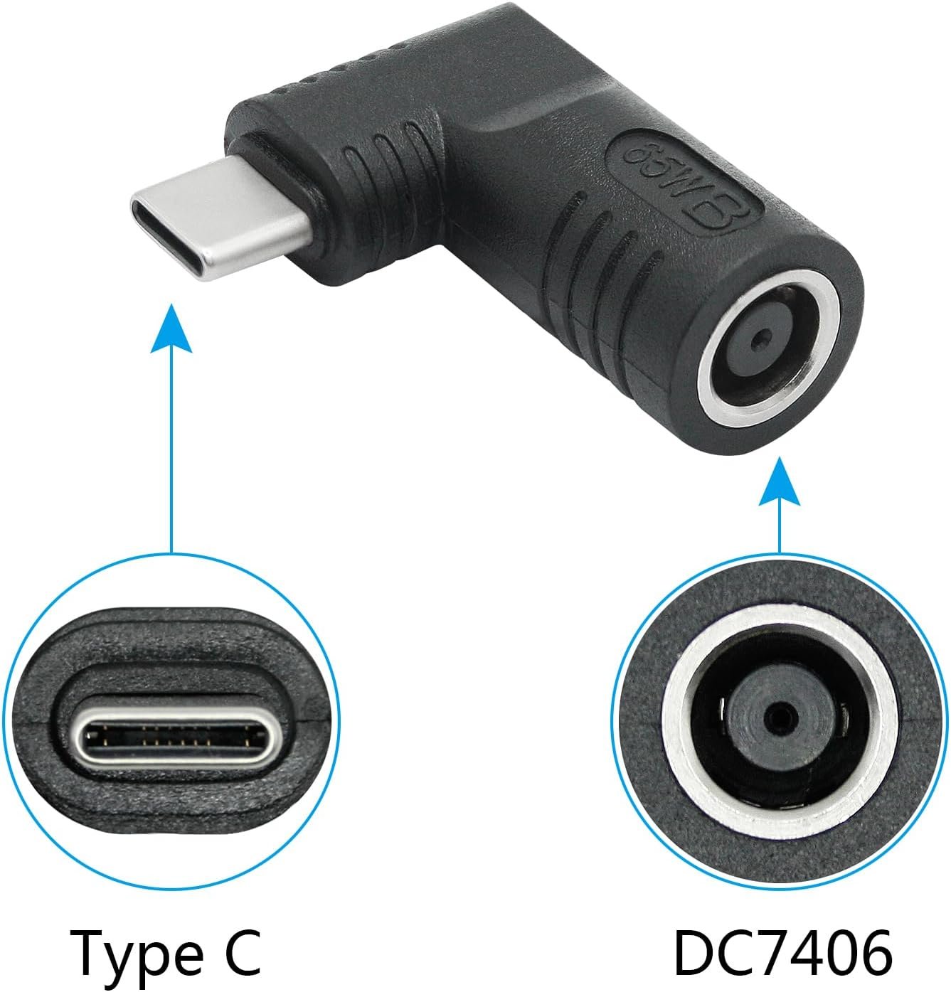 Right Angle DC 7406 to USB C Connector Adapter, 90 Degree PD 65W DC 7.4mm x 0.6mm to USB Type C Male Plug Power Charge Adapter for Laptop, Phone – Black