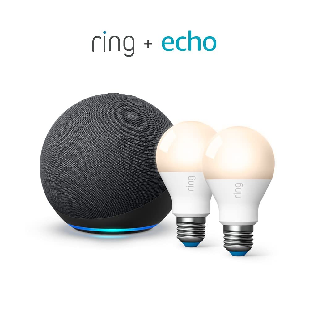 This bundle includes Ring Smart Lighting – A19 Bulb, White (2-pack) and all-new Echo (4th Gen) – Charcoal.
