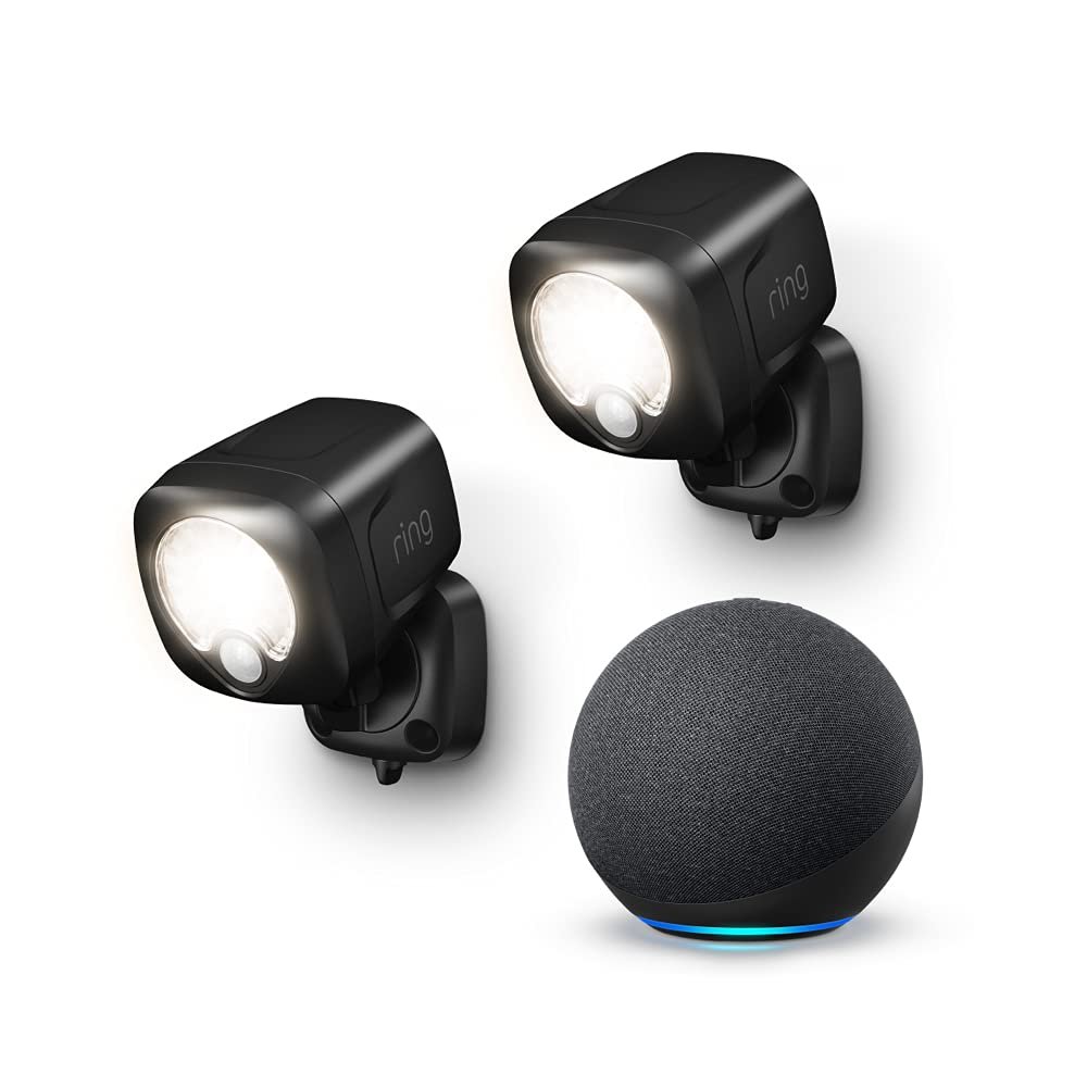 This bundle includes Ring Smart Lighting – Spotlight, Battery-Powered, Outdoor Motion-Sensor Security Light, Black (Starter Kit: 2-pack) and Echo (4th Gen) – Charcoal