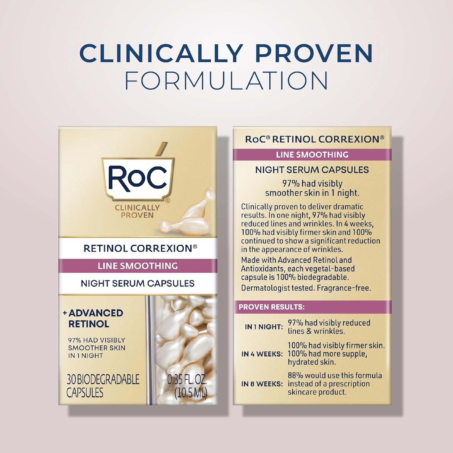 RoC Retinol Correxion Anti-Aging Wrinkle Night Serum, Daily Line Smoothing Treatment for Fine Lines, Dark Spots, Post-Acne Scars, Unscented, Stocking Stuffers, 30 Individual Capsules, 0.35 Ounces