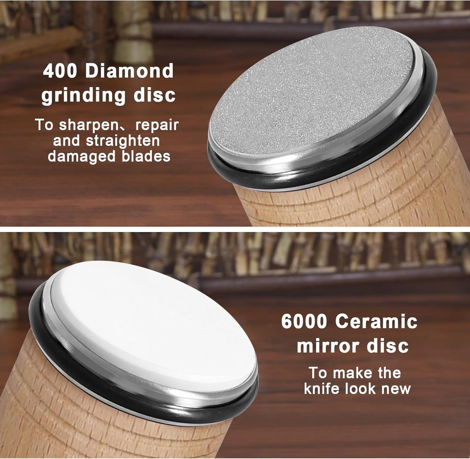 【Professional Knife Sharpener & 2PCS Replaceable Honing Discs】We equipped 2PCS Replaceable Honing Discs. 400# Hard Diamond Grinding Disc – Suitable for old or dull knives for sharpening, repairing and straightening damaged blades;6000# White Finer Ceramic Honing Disc – Suitable for high tool sharpness requirements.