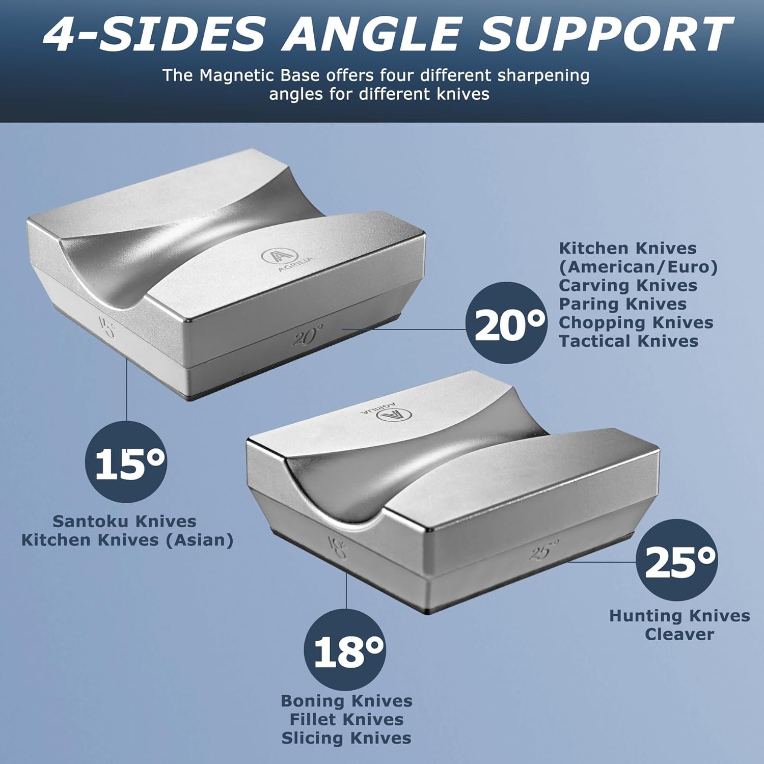 VERSATILE GRINDING ANGLES FOR PRECISION SHARPENING: Our comprehensive roller knife sharpener kit comes equipped with a multifunctional magnetic angle base, offering four distinct grinding angles to cater to all your sharpening needs: 20 degrees for standard kitchen use, 15 degrees for ultra-fine slicing, 18 degrees for Santoku and Asian knives, and 25 degrees for outdoor and pocket knives. Each angle is meticulously calibrated for specific blade types, ensuring the perfect edge every time.