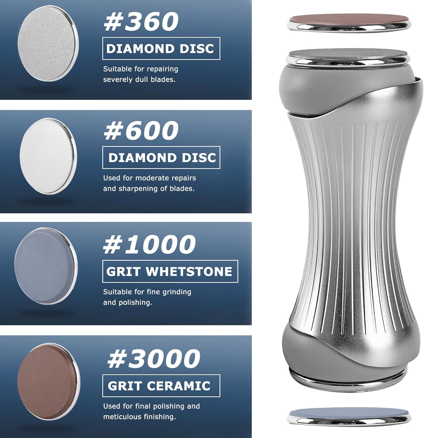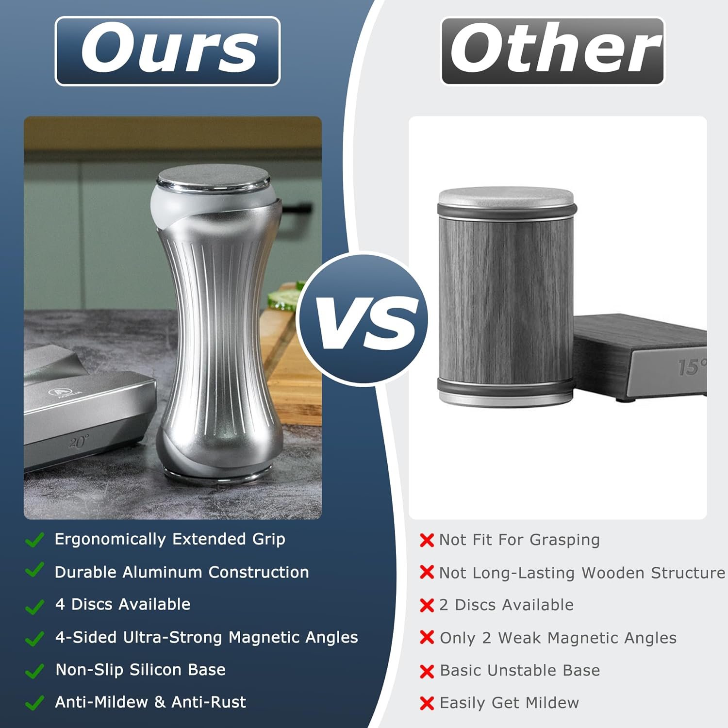 EXPERT-LEVEL KNIFE SHARPENING SYSTEM: Designed for both novices and culinary aficionados, our roller knife sharpening system features a silent rolling mechanism, a powerful magnetic base, and a vintage aesthetic. Simply glide the roller with minimal effort to sharpen your knives like a seasoned pro. Our system allows for effortless disc replacement and dry sharpening, streamlining your blade maintenance routine and ensuring your knives are always ready for action.