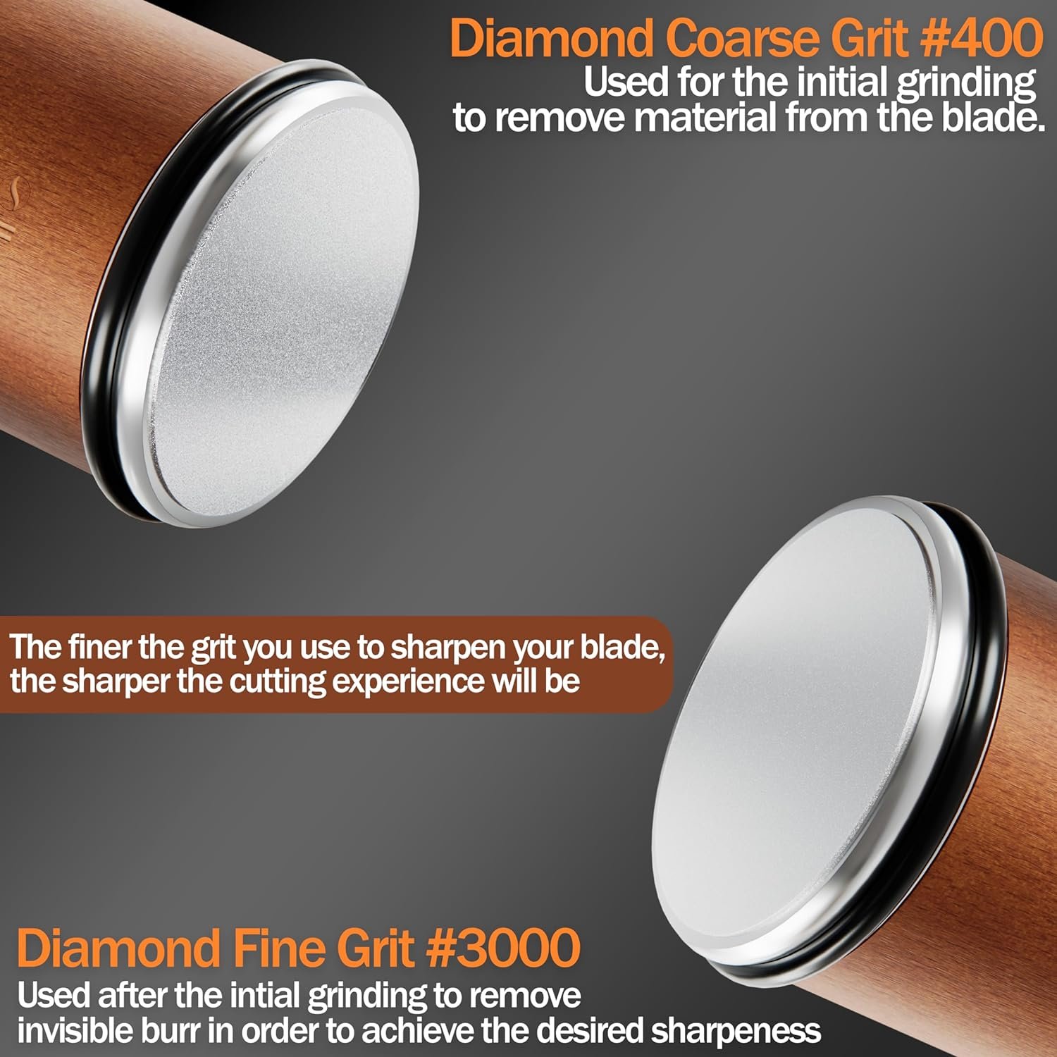 Widely Used Diamond Grinding Discs: The blade sharpener has 2 diamond grinding discs of different granularity, 400 for initial grinding of the knife’s blade and 3000 for achieving an ultra-fine polishing and desired sharpeness by removing all the possible burr.